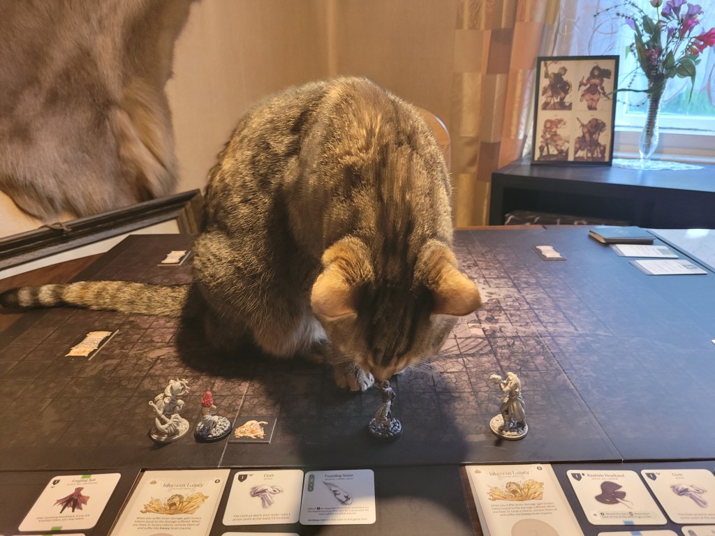 As the Feline Entity left eventually, the Butcher drew its first card: Gaze of Truth, targeting Ragnar. Fortunately it was a little too far away to trigger the effect. The Butcher is, of course, a Berserker and draws 2 cards per turn. Wild Carve. Ragnar is only hit on 7+, the Butcher missed twice. With a dash, he evaded the bleed.