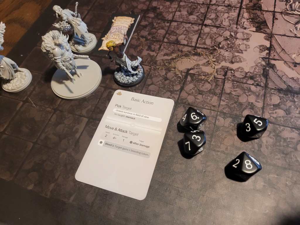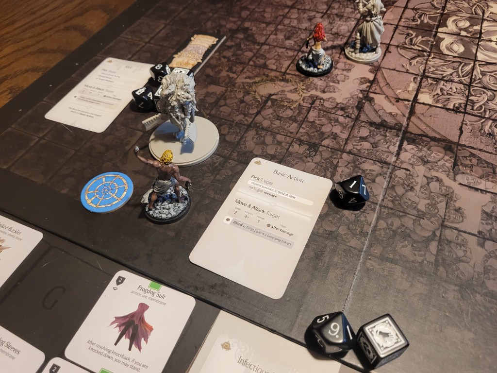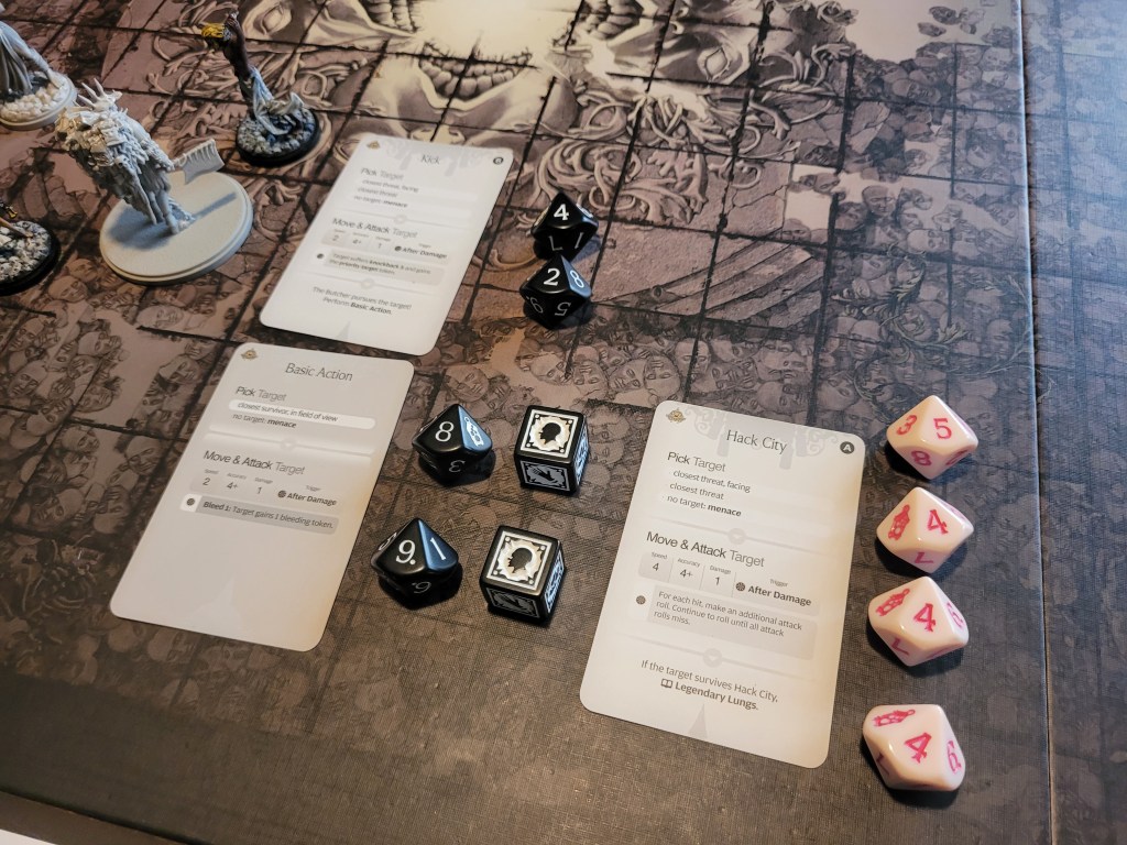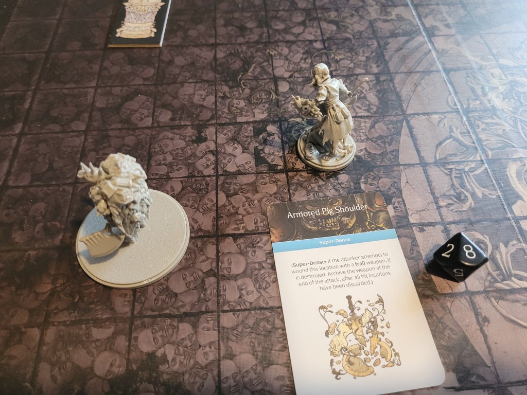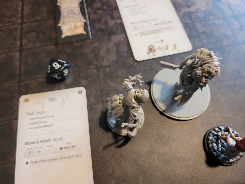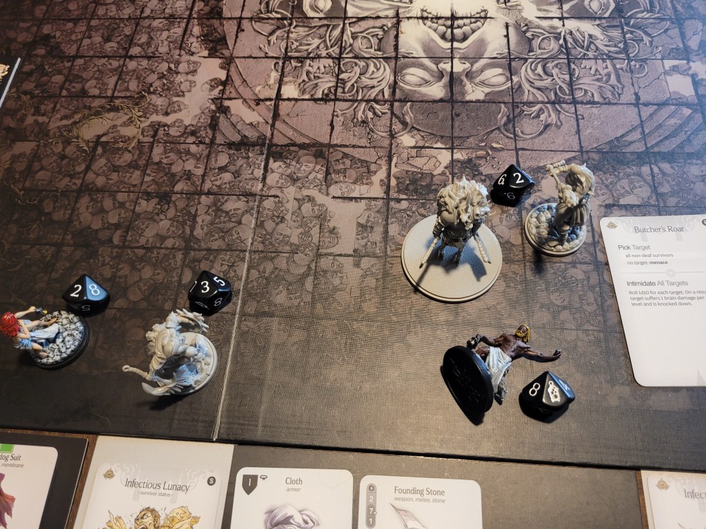 9 cards remaining. The Butcher is also a Fast Target, and thus every monster activation, its Hit Location deck is shuffled. It then drew its first card: Butcher’s Roar. Luckily only Ragnar was knocked down. The second card was much worse: Infinite Kick. It runs up to Hysteria, who dashed out of the way to avoid the attack. And a third card: Bite. That’s horrifying! It his once and we dodge,..