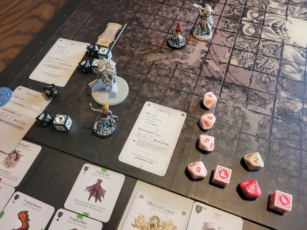8 cards remaining. First card: Kick. Uh oh, this could be bad. Ragnar was close enough now for the Butcher to switch its target, 2 hits and a Basic to follow up. 1 more hit, but we dodged that. Second card: Hack City. 2 hits on 6 rolls. That was still okay, but it gave me a fright. Ragnar gained 3 survival from the experience.