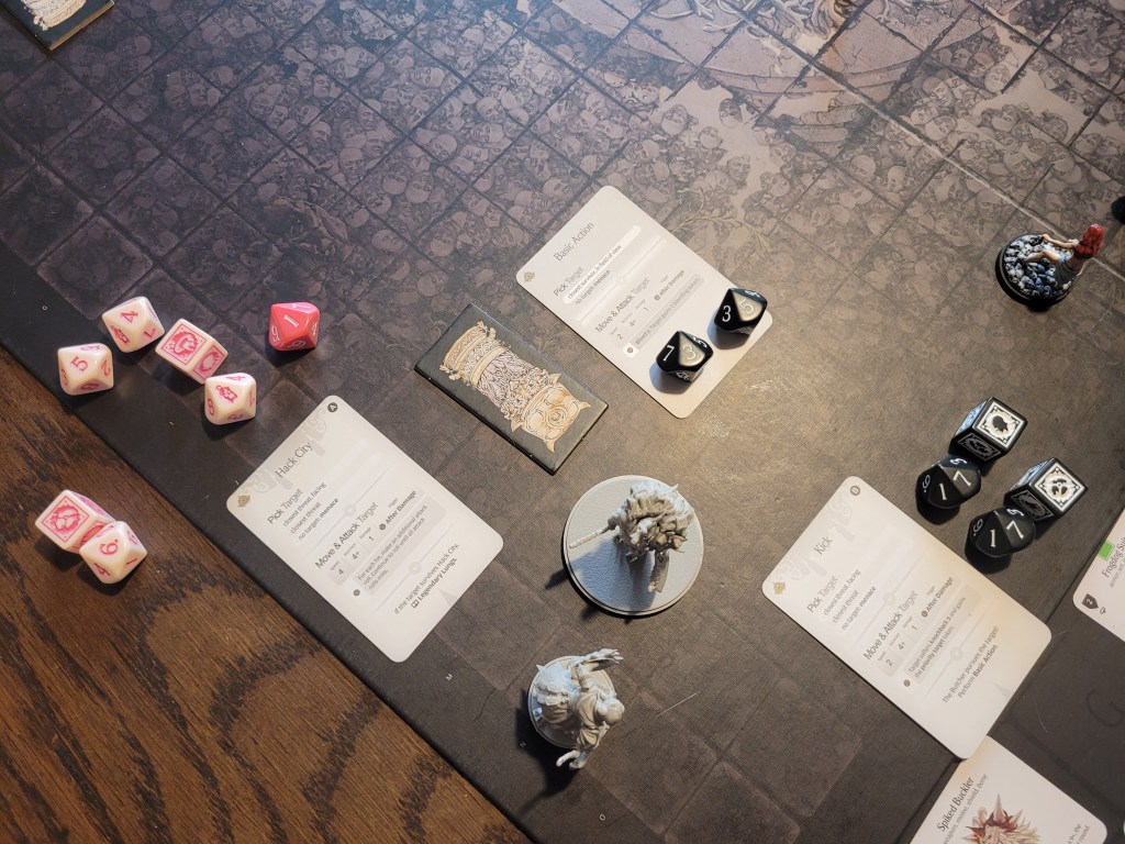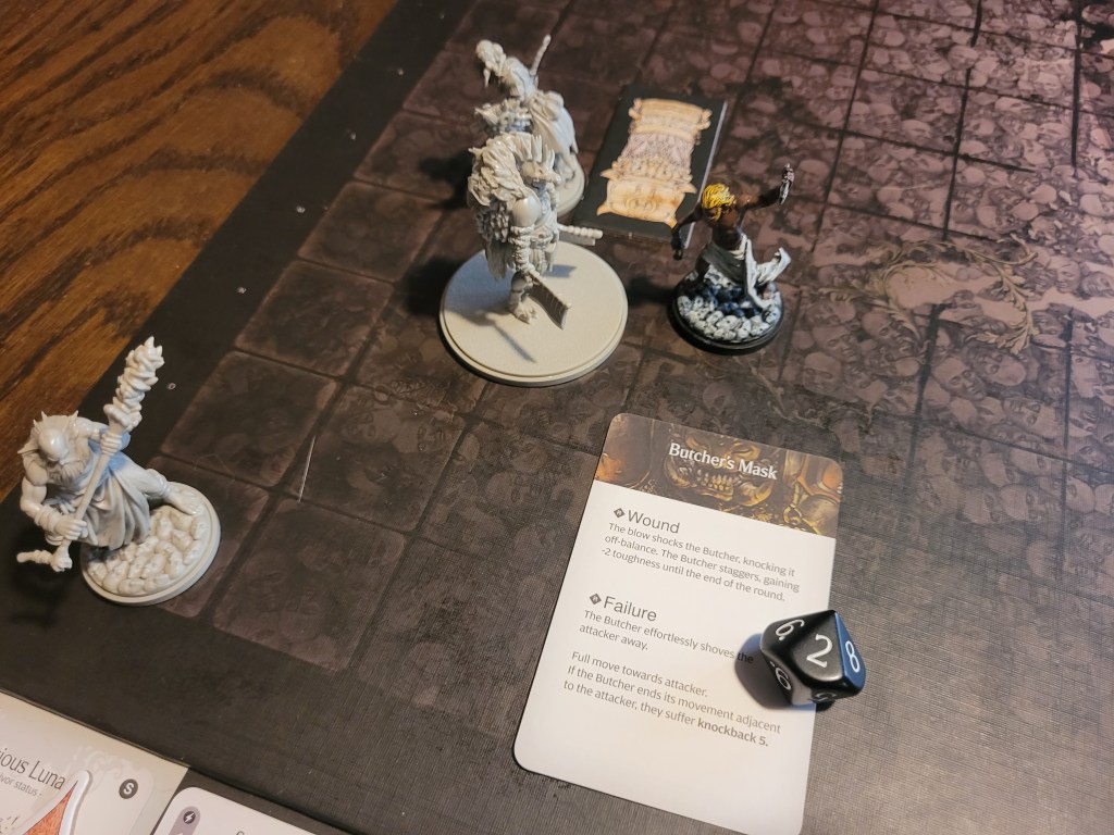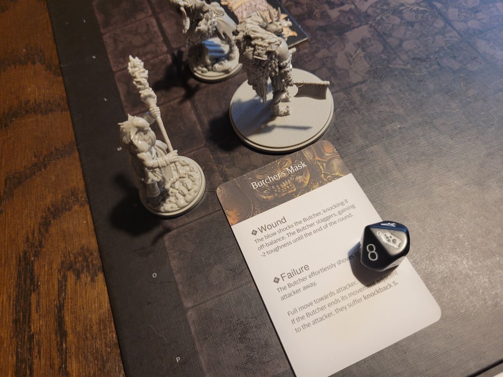 This already felt like we were wounding off the wrong cards. Hysteria threw her darts. 2 hits! 1 wound! The Butcher was knocked down once more. Ragnar even triggered Bold (+1STR). And she even got a second wound in! Seeing the opportunity Ragnar plunged his daggers down. One more wound!