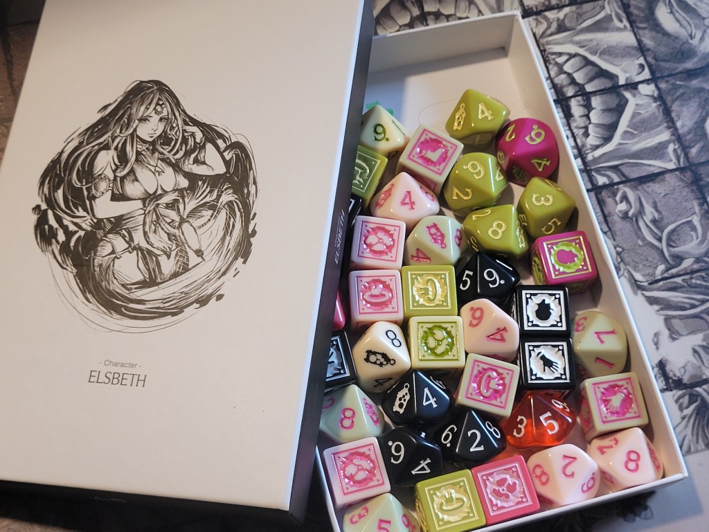 Elsbeth also comes in this sturdy and beautiful box, rather than the typical tuck boxes, which has the perfect size for several sets of dice if you are lacking a storage option amongst your game boxes.