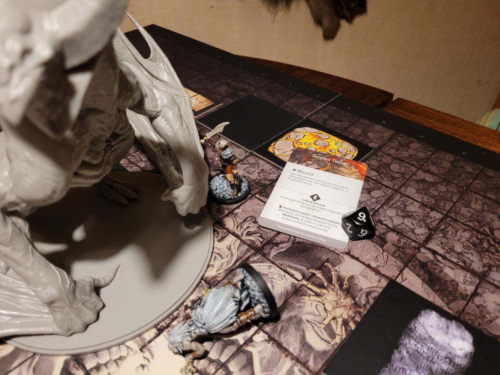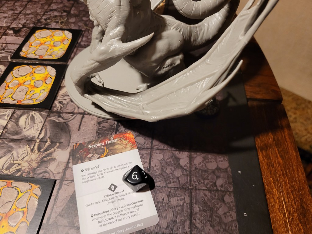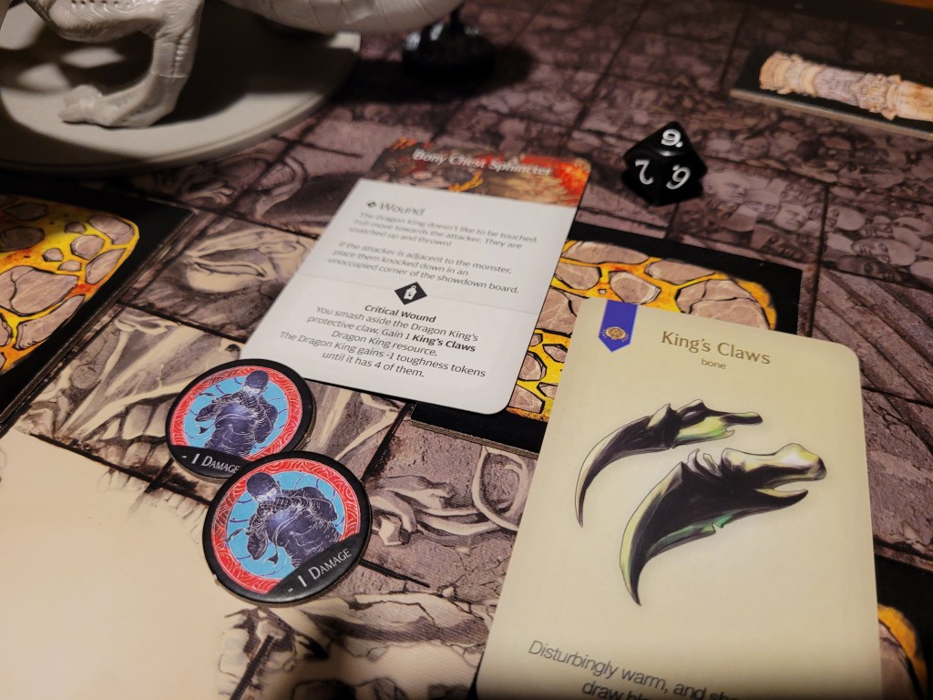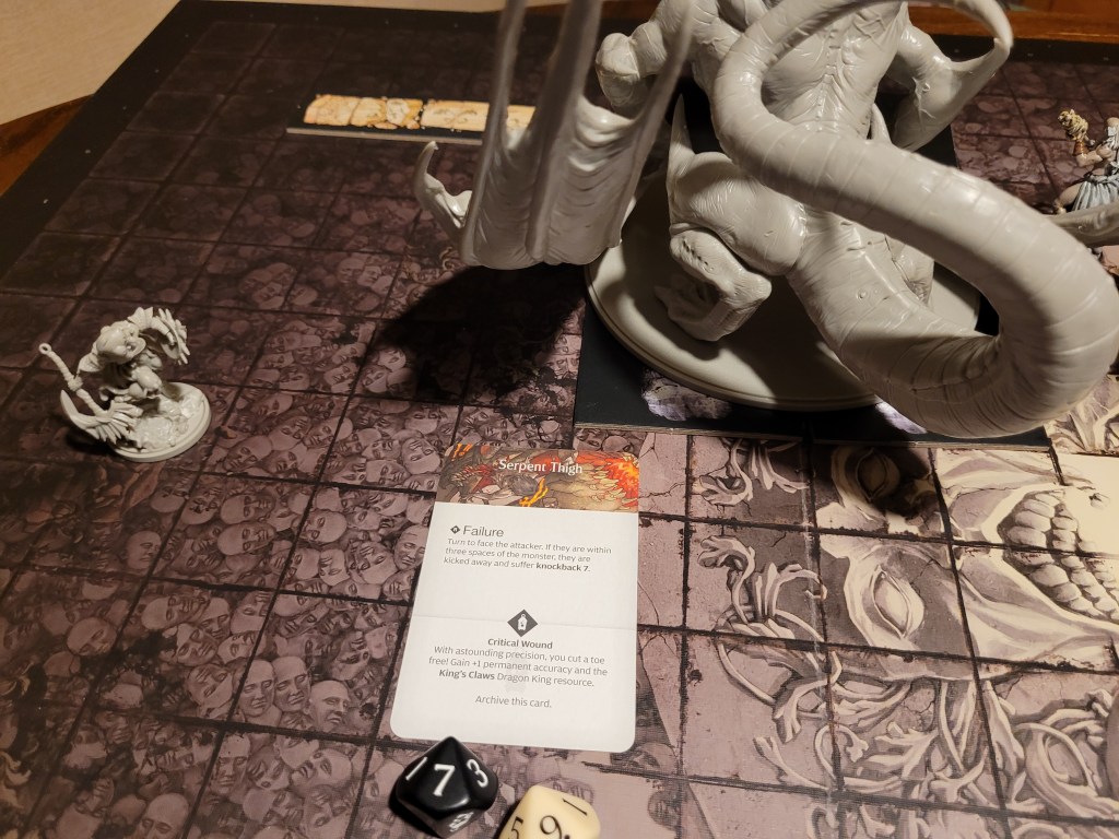 Mars saw an opportunity and dashed in. Hitting twice, the first strike landed true and dealt a critical hit to the monster’s perfect smile, not only gaining us the King’s Tongue resource, but also putting a -1DMG counter on the monster!