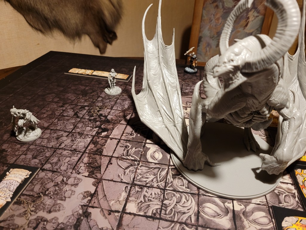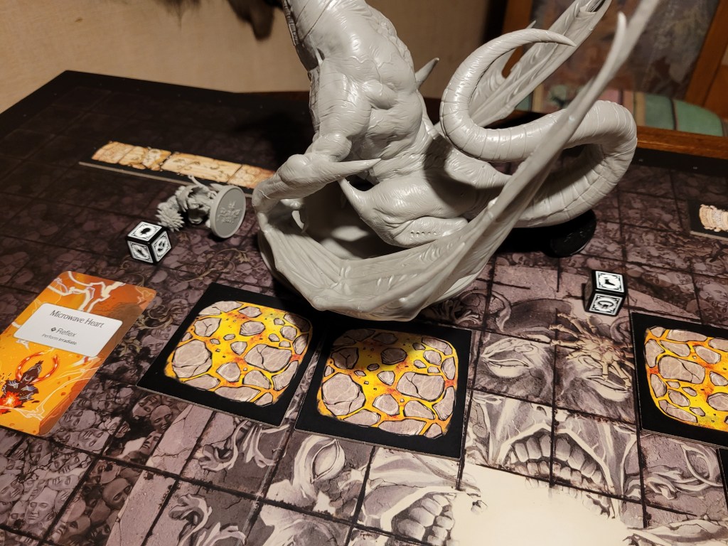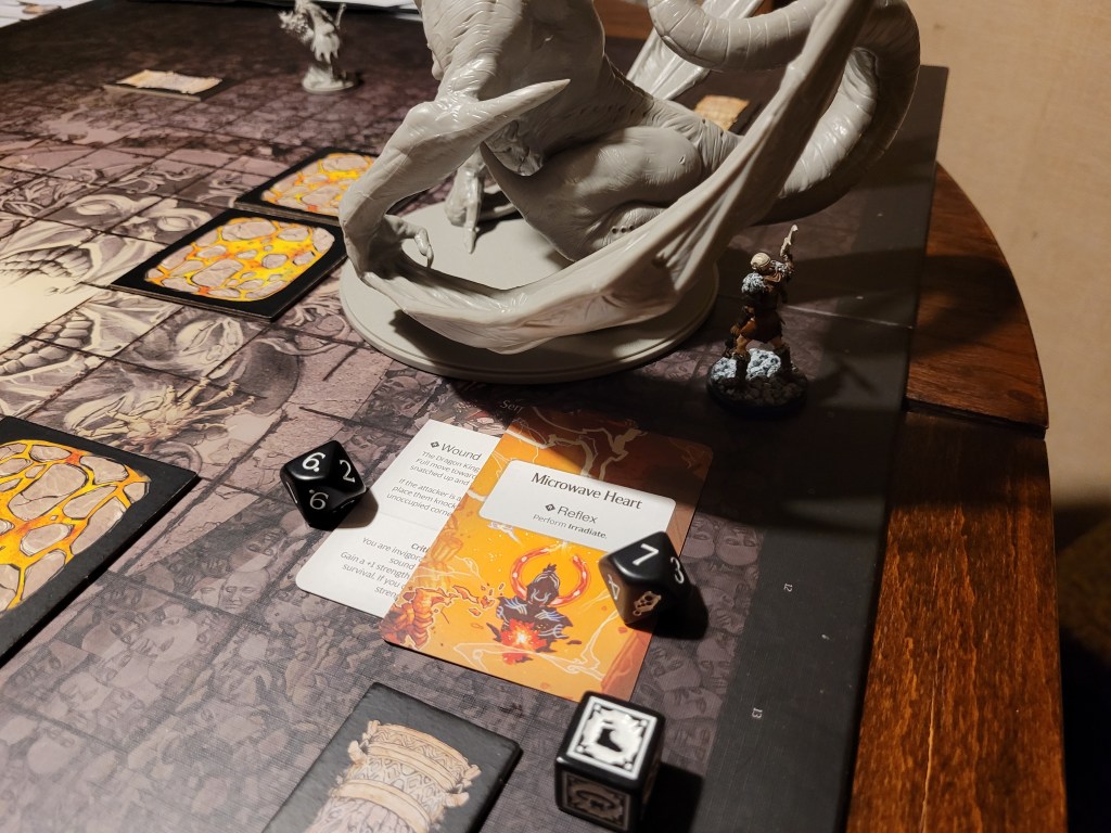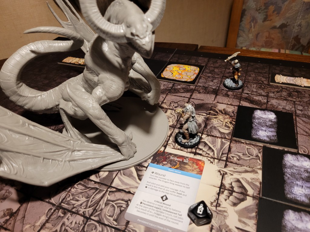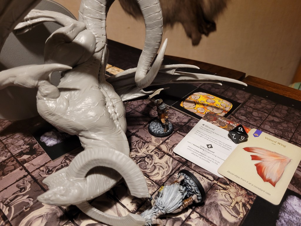 Mars saw an opportunity and dashed in. Hitting twice, the first strike landed true and dealt a critical hit to the monster’s perfect smile, not only gaining us the King’s Tongue resource, but also putting a -1DMG counter on the monster!