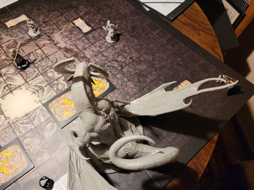Seconds later, Lucille hit the floor next to the monster. Her hip took the damage, it’s a severe. She rolled a 2… we rerolled into a 1. She died, crushed by the force of the impact.