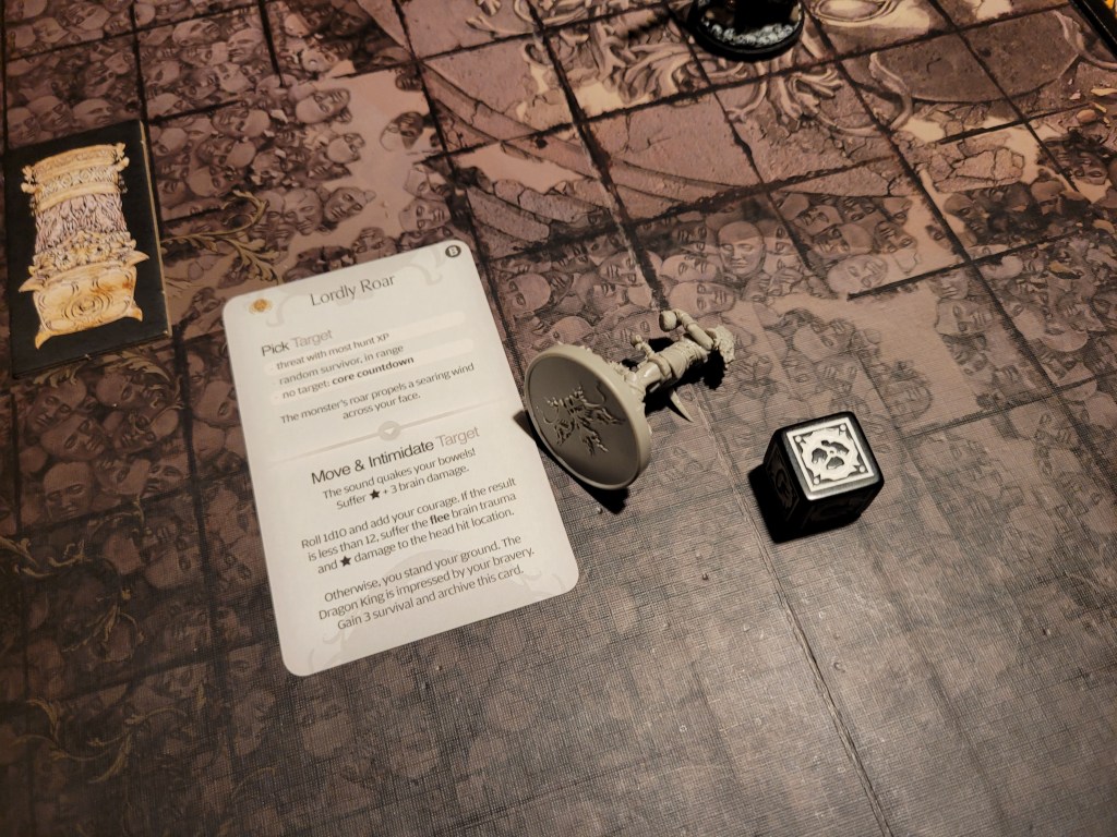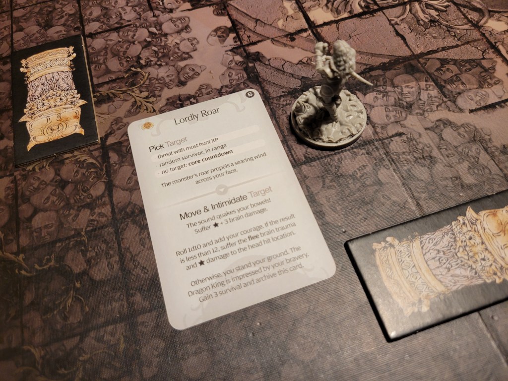9 cards remaining, one -1TGH-token, the Dragon King drew Lordly Roar. Once again it targeted Lucille. Taking 4 brain damage immediately, she rolled against the attack with little hope of success. With only 2 courage she would need a perfect 10. And she rolled a 9. Whilst ‘almost’ wasn’t good enough, it still surprised me. Lucille suffered the Flee brain trauma and ran straight into the stone column behind her.