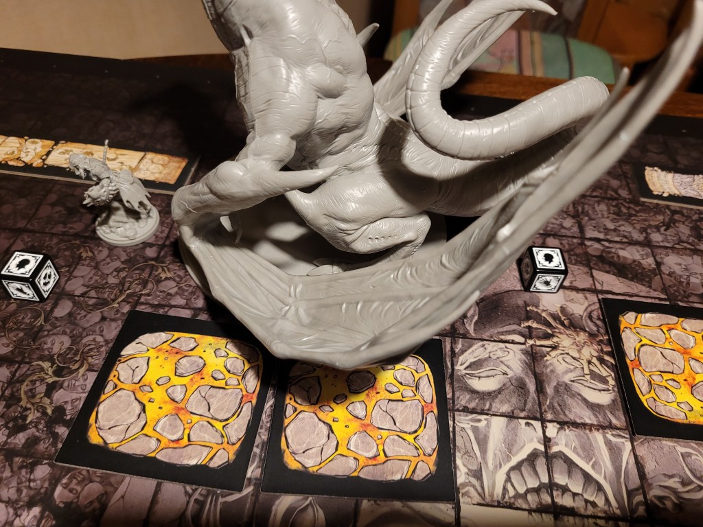 As all the lava pools cooled into obsidian pillars, Mars dashed in again to strike, but as his wound fails he just gets pushed back again. Lucille, last one able to still dash also went for it, desperately try to add one more wound. It took everything but it was a success!