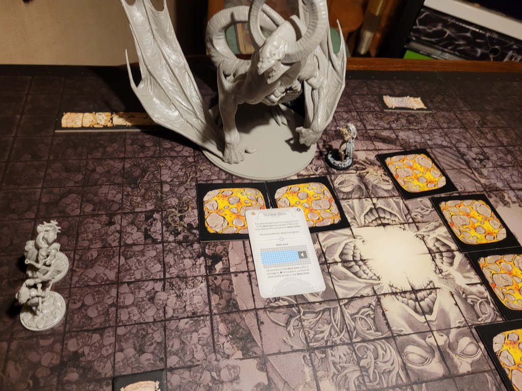3 cards remaining, four -1TGH-tokens, Nuclear Blast got drawn again. The monster turned to Selen and Thalas, who both dashed to safety before any damage was dealt.