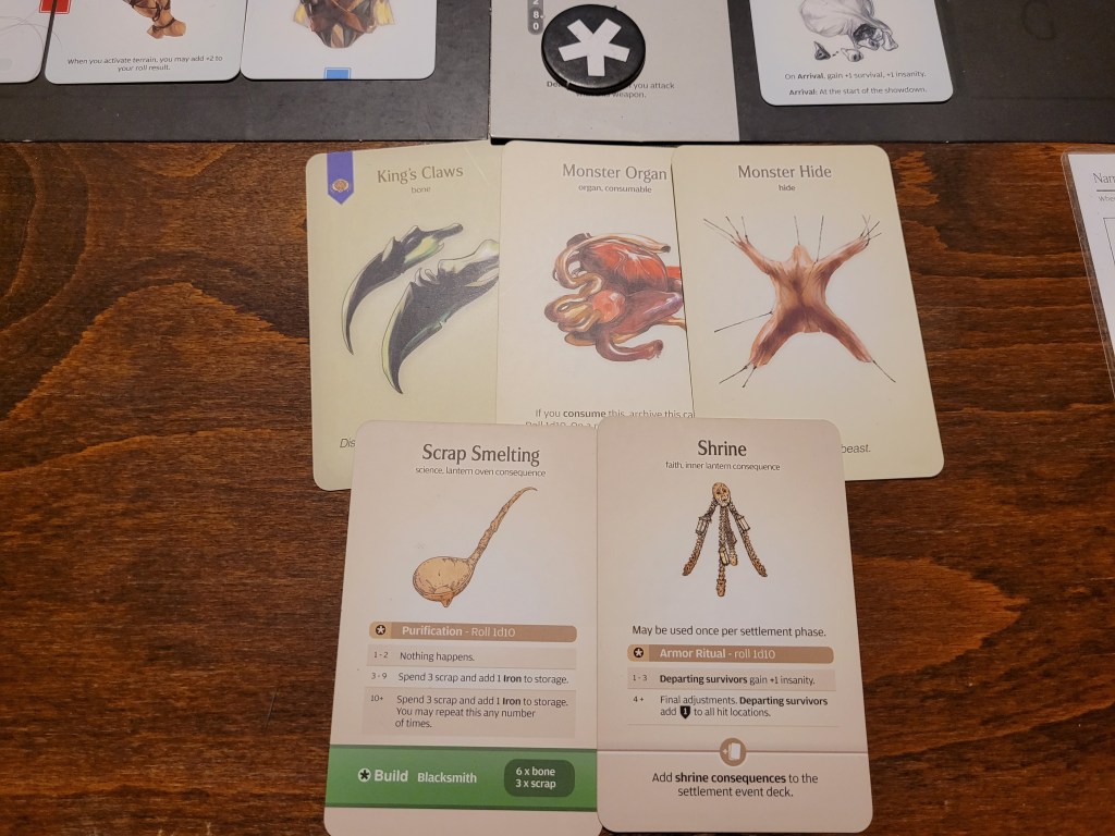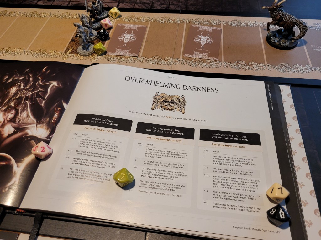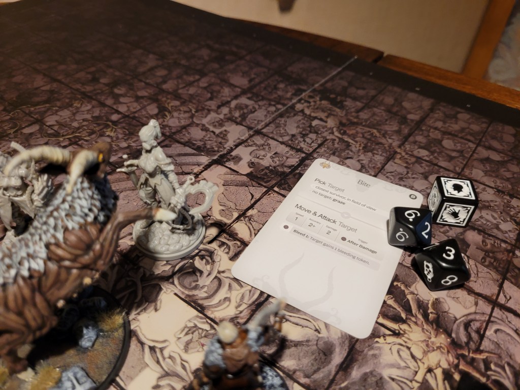 As our survivors make their way back home we are surprised by this year’s settlement event: Startling Barks! A random survivor was picked and I rolled on the table for Mars – the recently risen all-star. He continued his lucky streak by rolling really high and getting an ability for himself: Gravel Guts – which was a nice +1 to severe injuries to the body and he could ignore intimidate actions as well.