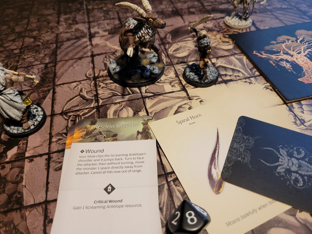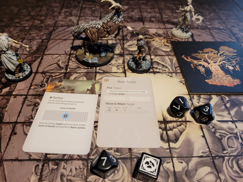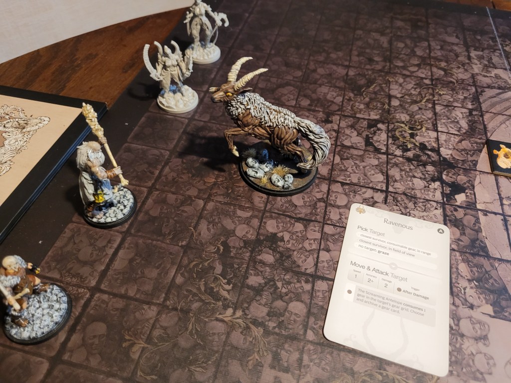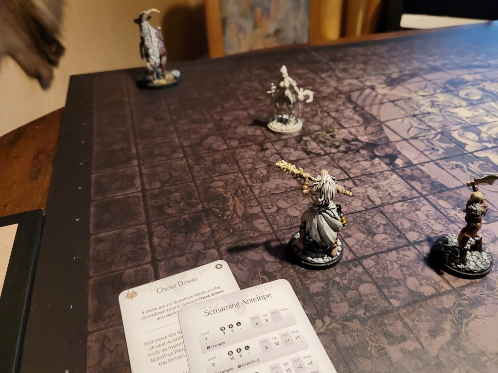 15 cards in the deck, the first card drawn was Ravenous. That wasn’t a great one to see first. Of course, the first attack from the antelope typically misses and this time was no different. It came running at us but fell short, whilst Diabolical did not find a target, which forced it to just full move forward again.