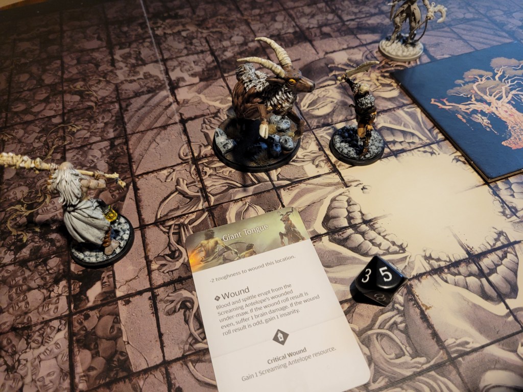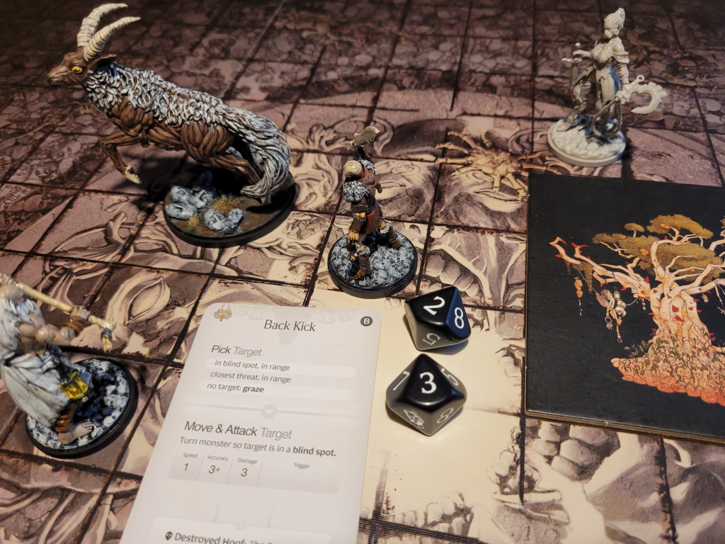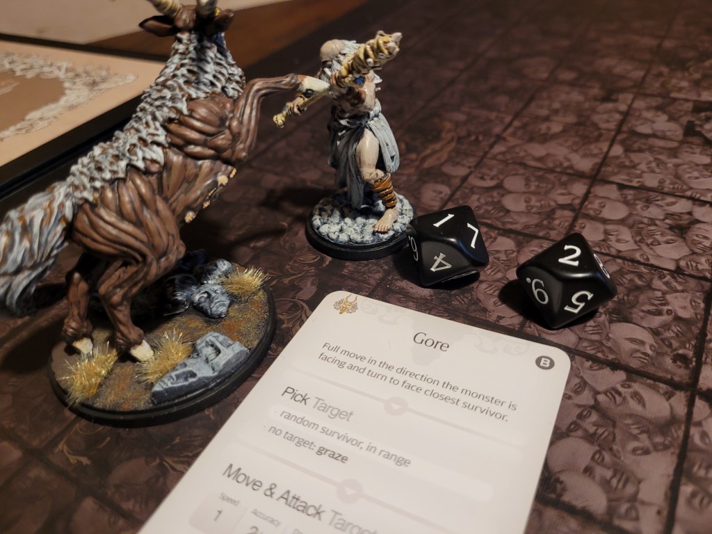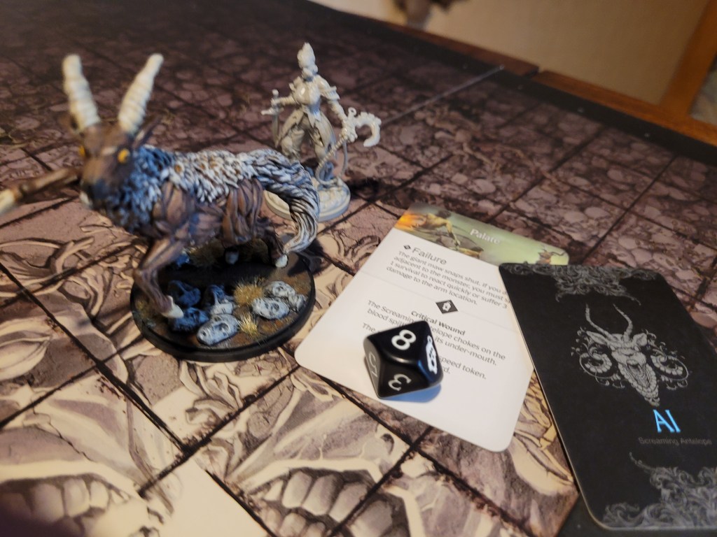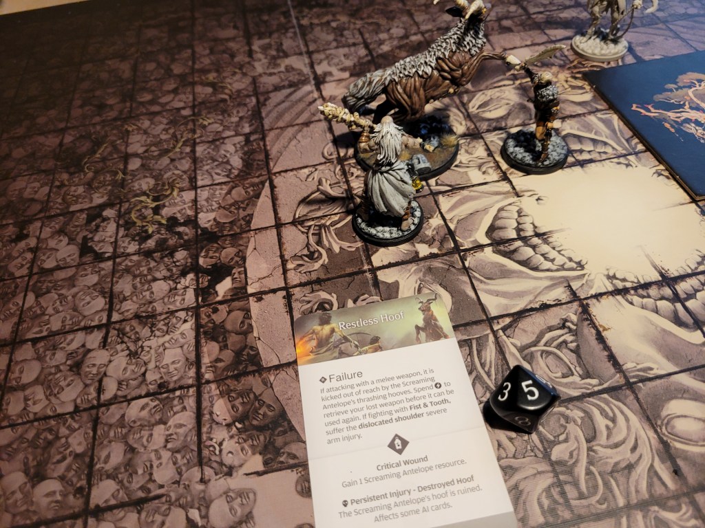 15 cards in the deck, the first card drawn was Ravenous. That wasn’t a great one to see first. Of course, the first attack from the antelope typically misses and this time was no different. It came running at us but fell short, whilst Diabolical did not find a target, which forced it to just full move forward again.
