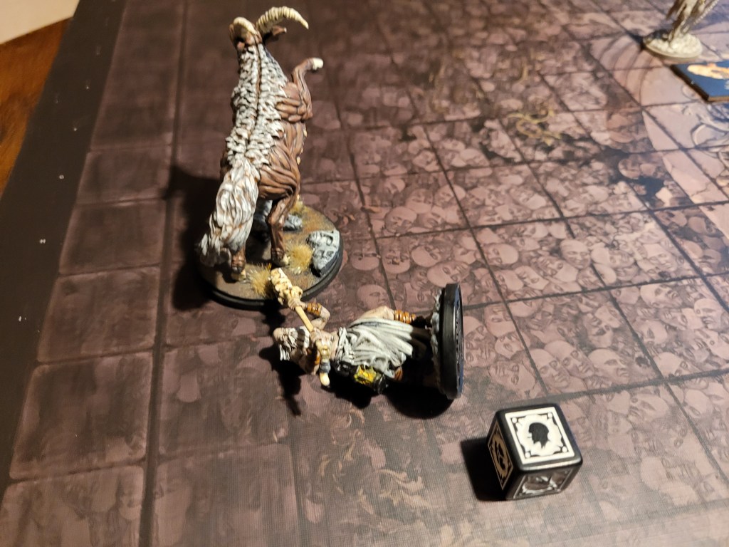 Mars ran in again, swinging and hitting the trap! It had to happen at some point. The positioning wasn’t terrible for us and the lope would just shoot off into the distance not running anybody over so the only real consequence was that Mars took a brain trauma. Having picked Accept Darkness for the settlement we got a static +2 to brain trauma rolls and Mars merely got knocked down with a 9.