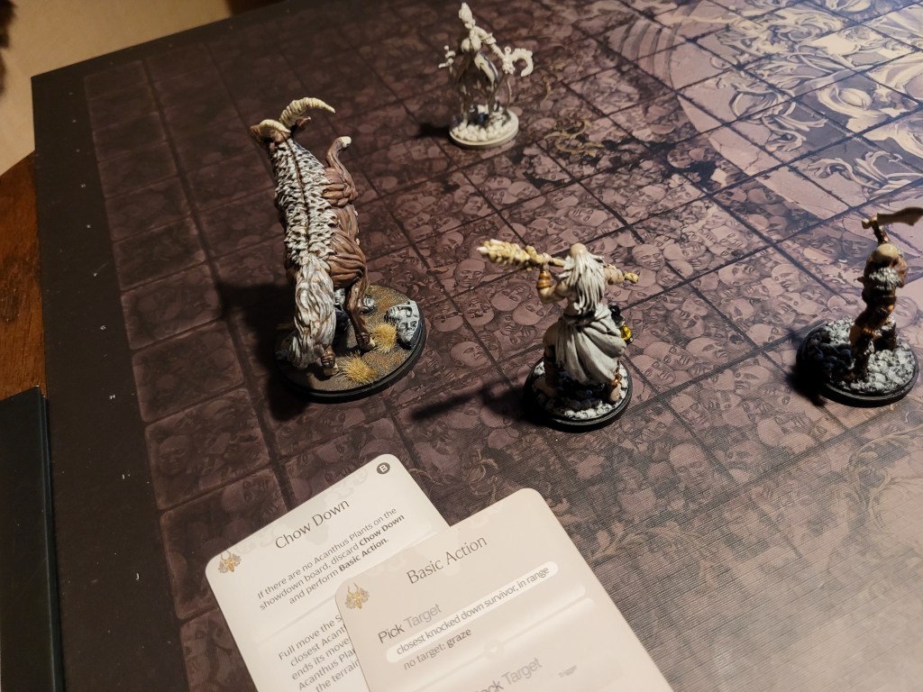 13 cards remaining, still, it drew Chow Down! And just as we got done picking weeds. No acanthus left, meant a basic attack. With no knocked down survivors around, this in turn meant the monster would go for its instinct.., to graze. Which, with no acanthus, meant it would just run off in a straight line. And with nobody in the trample zone it would move straight onwards again,