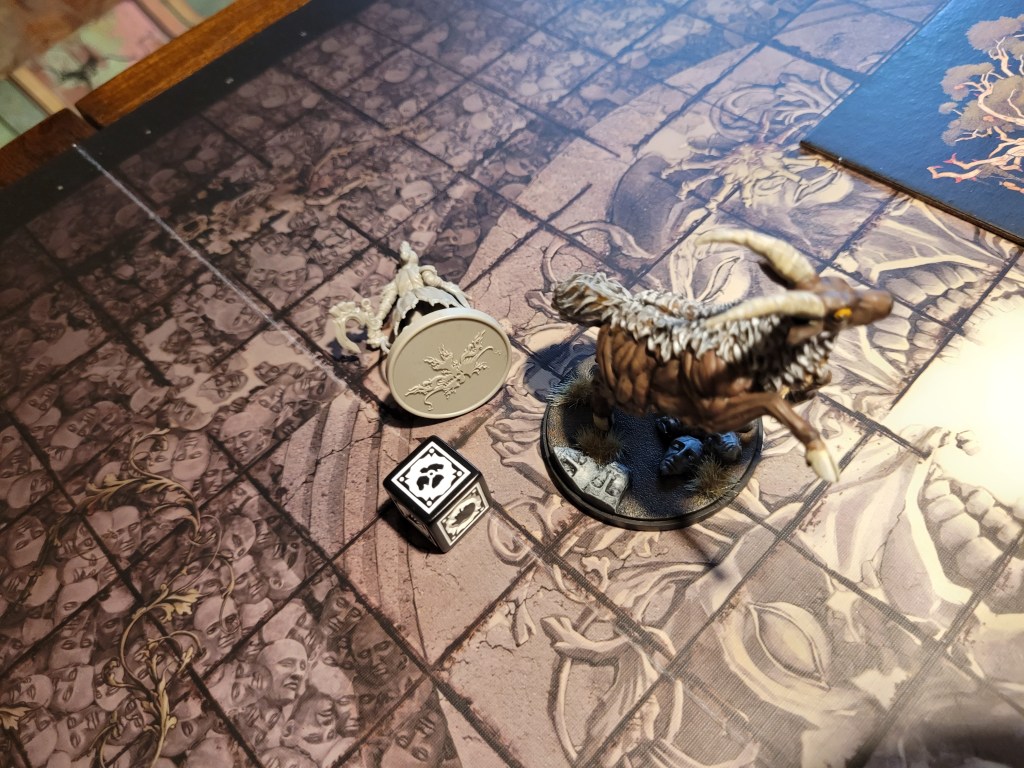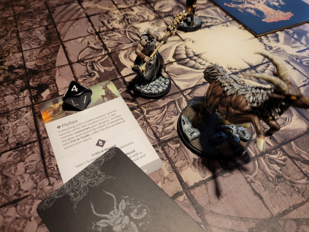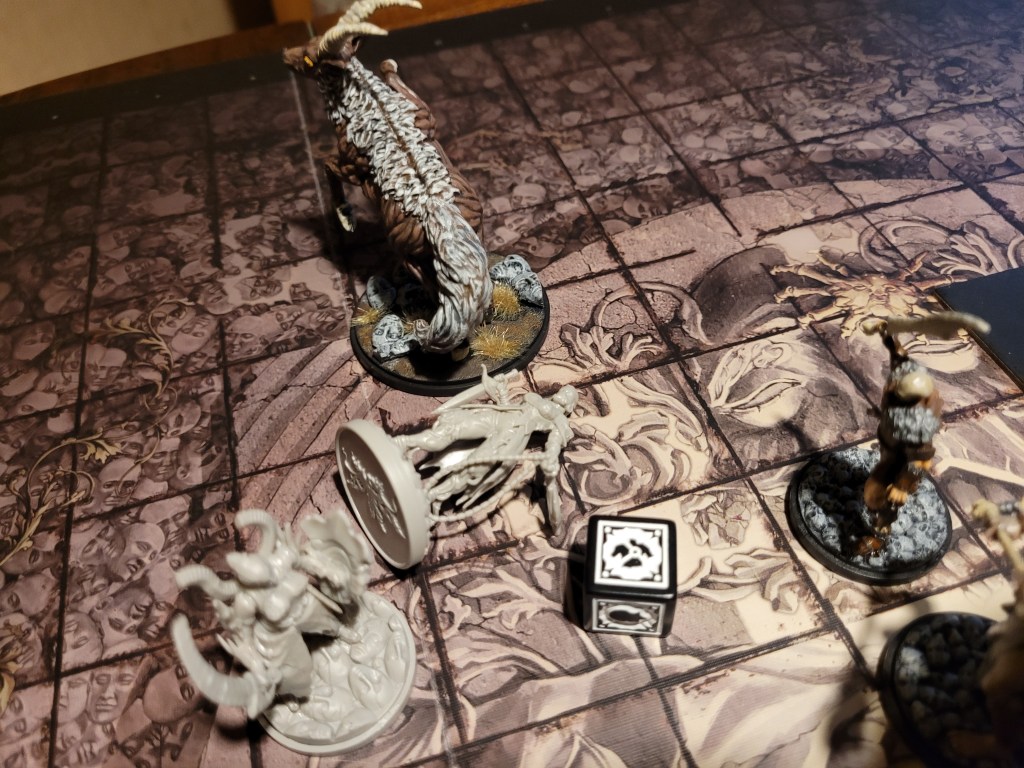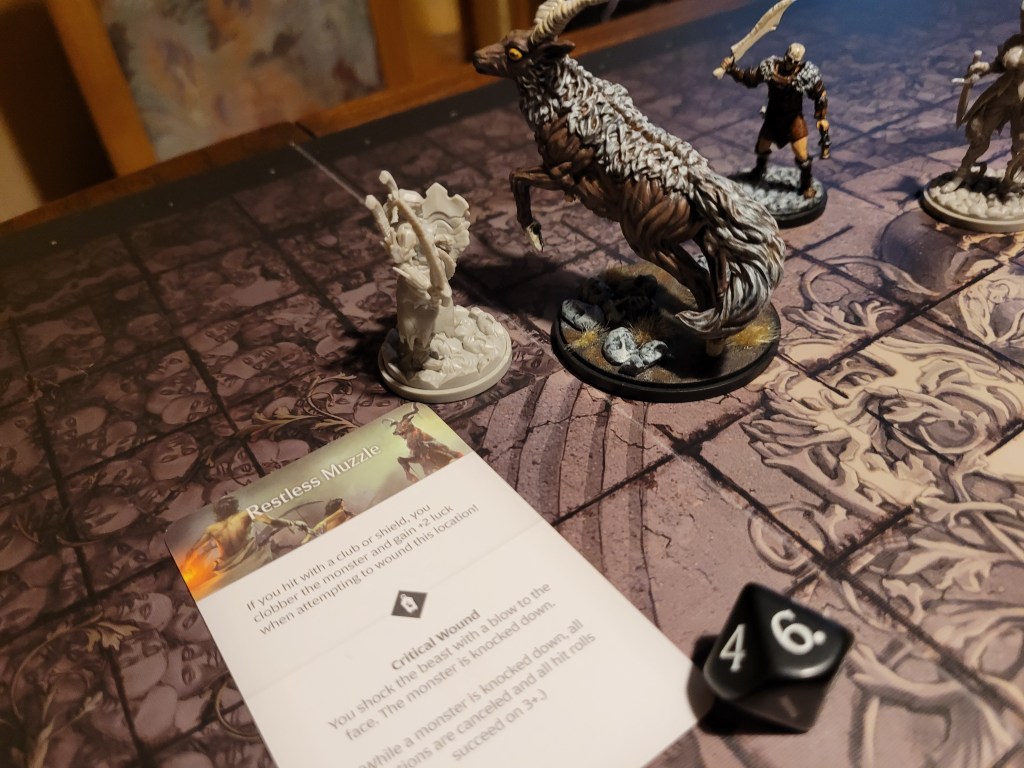 Sir Hermes engaged the monster to finish of the first turn – he got a perfect hit – getting an overpowering 36 total on his wound attempt. No crit and only 1 wound though. Club Mastery could not come soon enough.