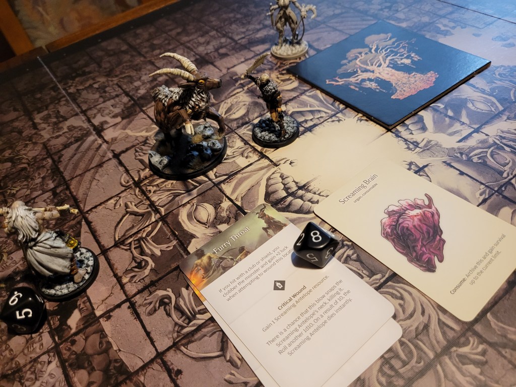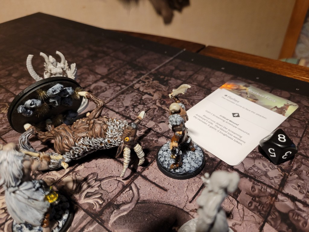 Mars then came running in, swinging wildly, he scored 2 hits, critting on 8+, we did roll exactly an 8 on the furry throat, gaining a screaming brain before we could attempt the cash in on the insta kill – which failed on a 9 – so close! A second wound followed afterwards.