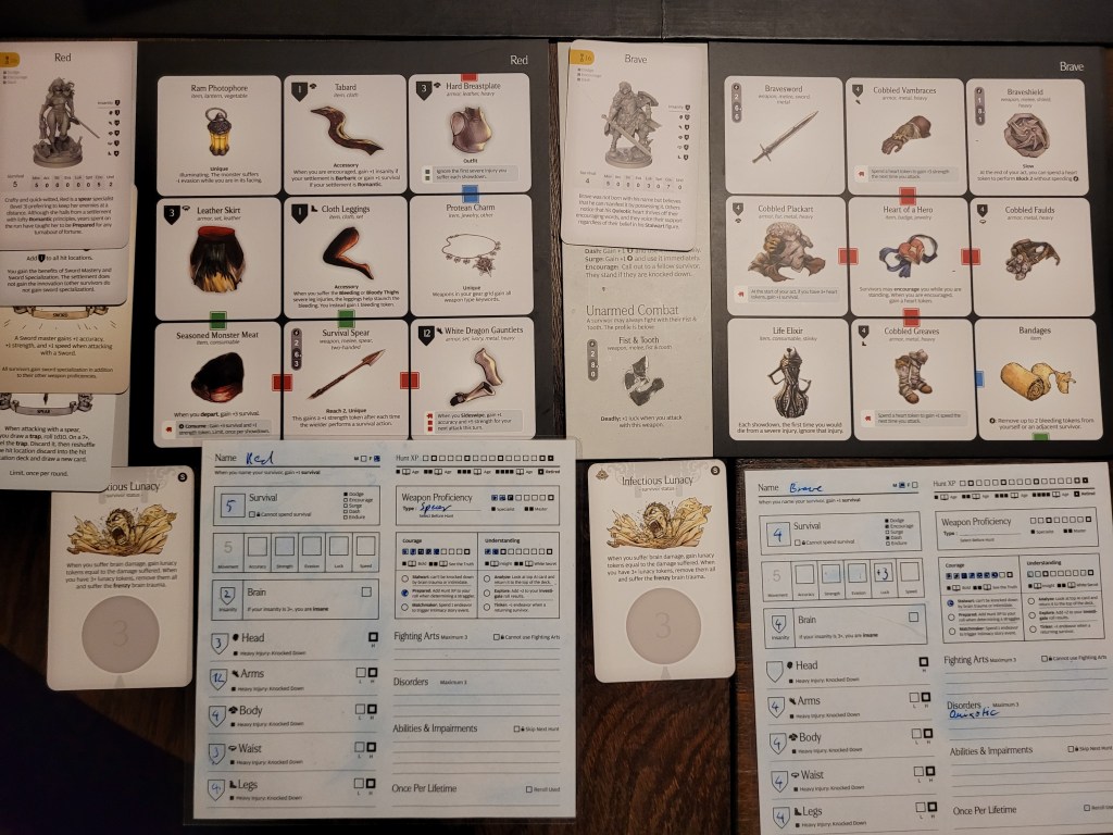 Brave gains heart-tokens (unique to him) every time he is encouraged while standing. He can spend these tokens for various effects, or stockpile at least 3 of them to eventually gain 1 survival per turn.