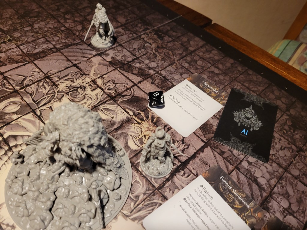 Desperate, Brave was moved in, having spent his remaining heart-tokens on +3STR and +1SPD for the attack. He only got 1 hit out of 3 and just barely wounded. The monster was knocked down again though, giving 1 more courage to each of them.