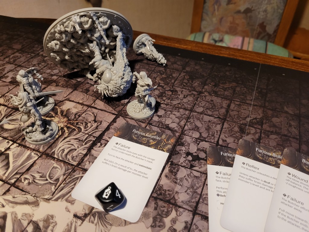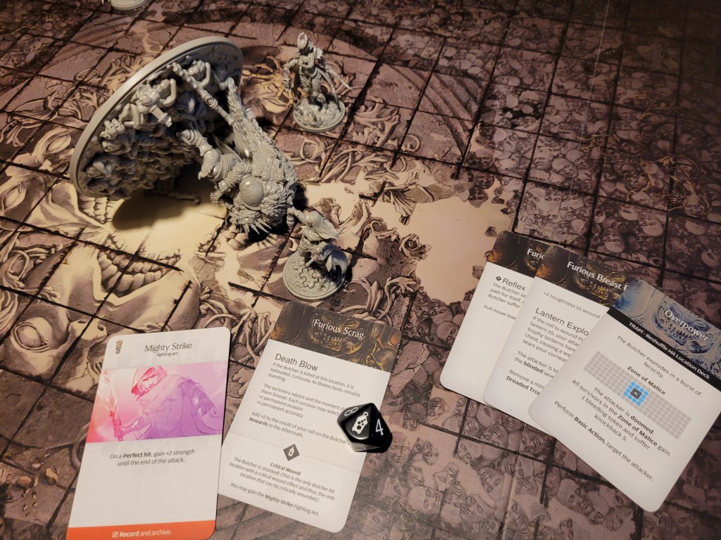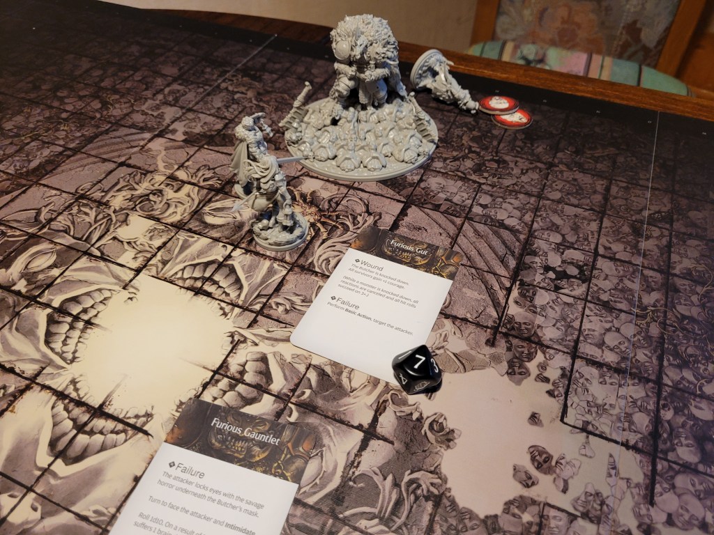 With the power of sword specialization she was able to assign rolls and attacks in a way that knocked the Butcher down again as everyone gained another +1 courage.