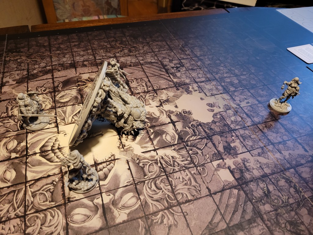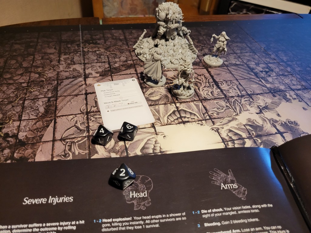 But he did knock it down once again, distributing another courage throughout the group. Hollow triggered her Bold (+3 survival/+3 insanity) and she saw her chance to attempt the killing blow. With the monster on the ground and her able to dash away and jump in with her armor set, the 5 she rolled was just enough to do it!