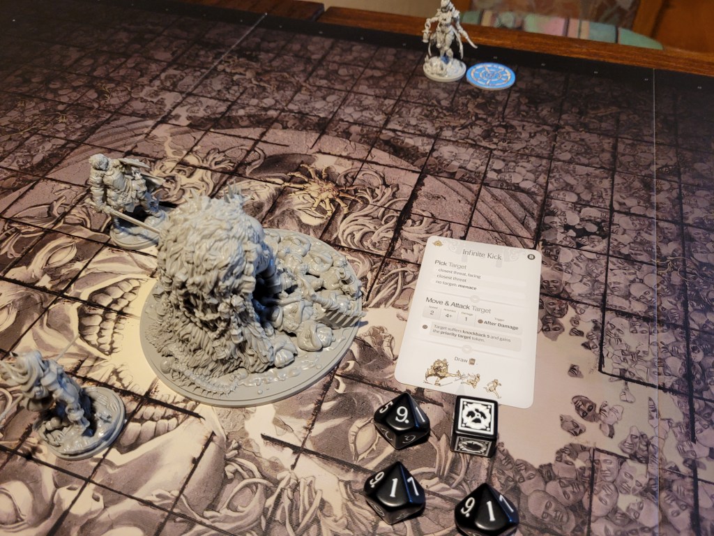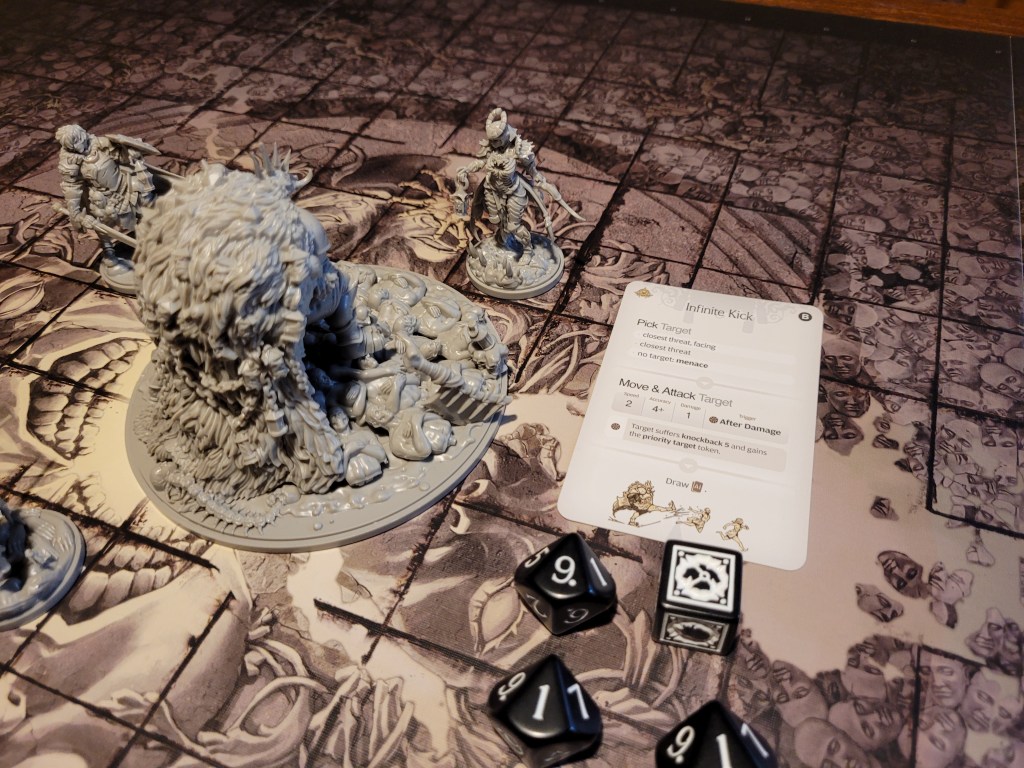 After finding and surrounding the dreaded monster, Hollow was the one to go first. She dashed into the perfect position to use the Dragon Armor’s effect – jumping exactly 5 spaces and attacking with an additional +2ACC +5STR.