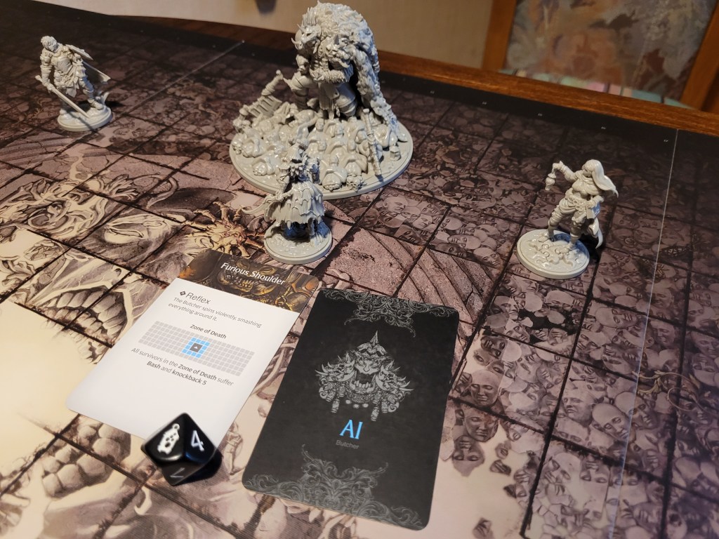 I let the Butcher go after Hollow – just a planned – which gained her 3 armor in all hit locations. To top it all off, the attack only hit once. Of course after Hollow had taken the knockback there would be a second card: which was Wild Carve. This one hit all 3 times and dealt 1 more extra damage after everything else was resolved. With no body the bleed did nothing to Hollow.