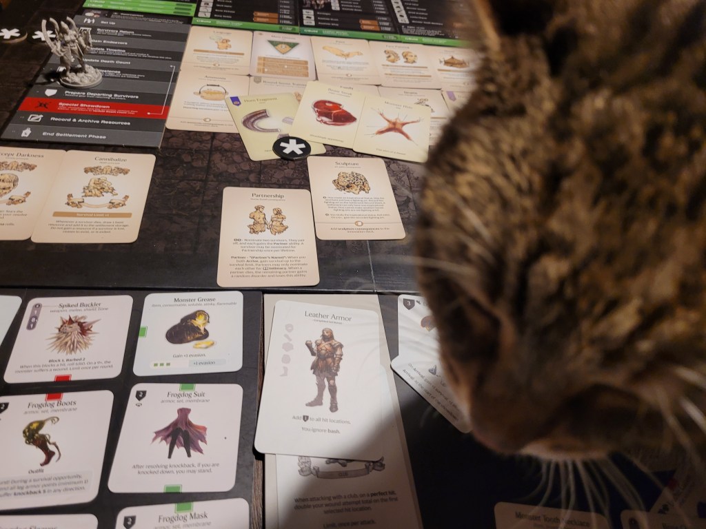 For the time being, I collected our rewards. Lelia (Escape Artist FA) hit age 3. But, of course, more importantly: Sir Hermes was a Club Master now! All that extra strength you’d gain on a perfect hit with a club, suddenly meant something (you deal an extra wound to the monster if the wound attempt total equals twice the monster’s toughness or higher) – not to mention the settlement wide foundational club knowledge.