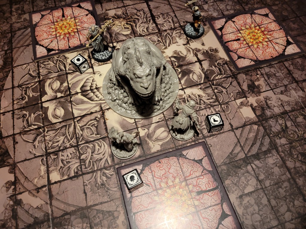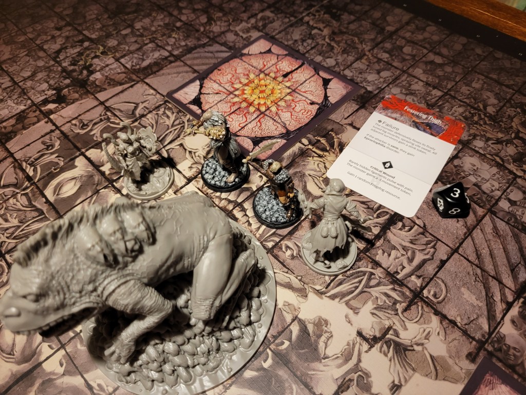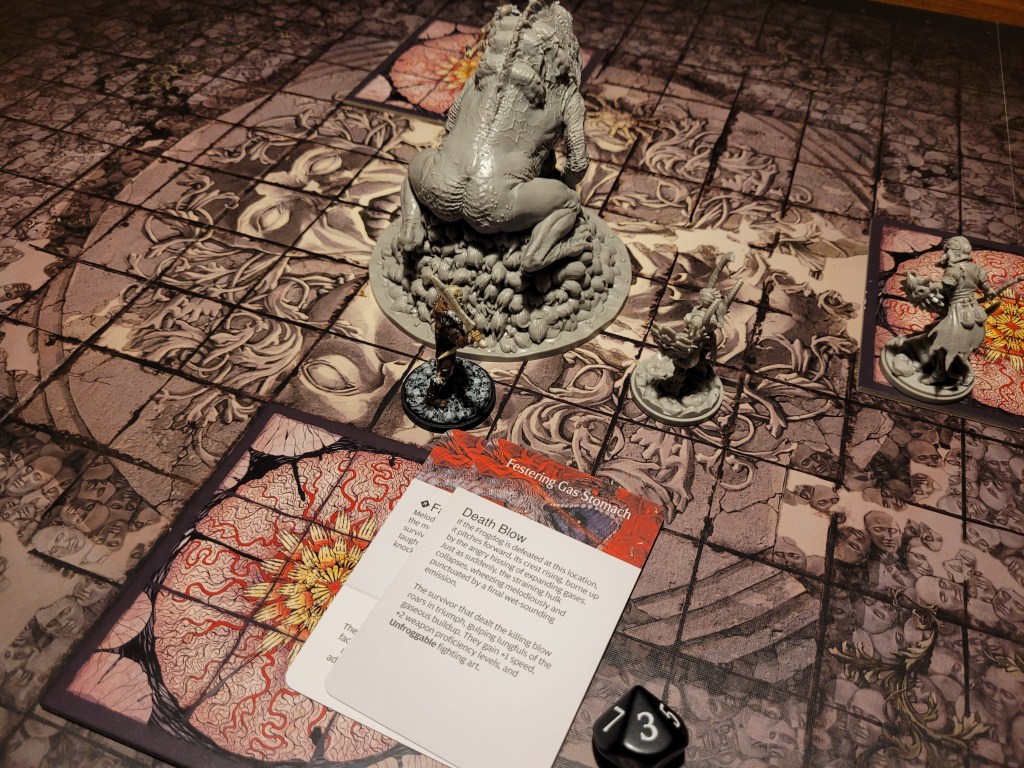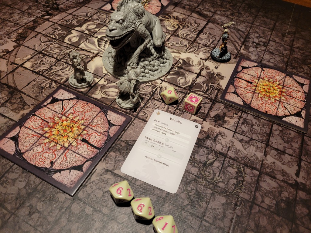As an AI card we drew Confusion. Without any valid targets, the monster instead backed off to the center of the board and the stink rose around Lelia, Mars and Ragnar.