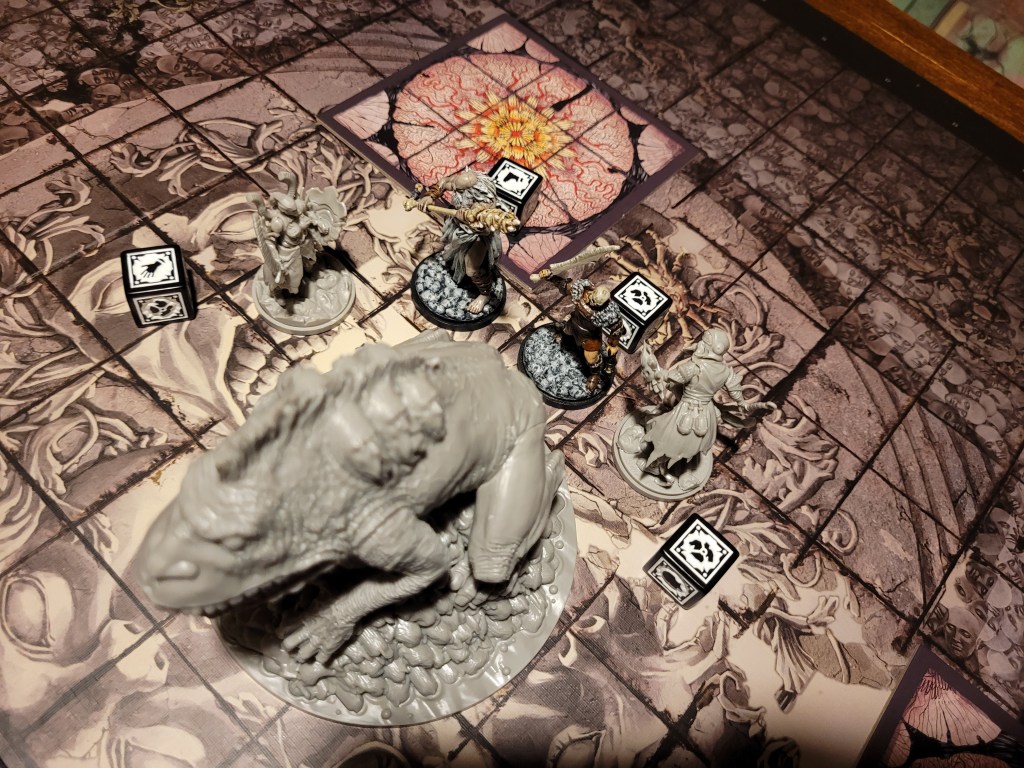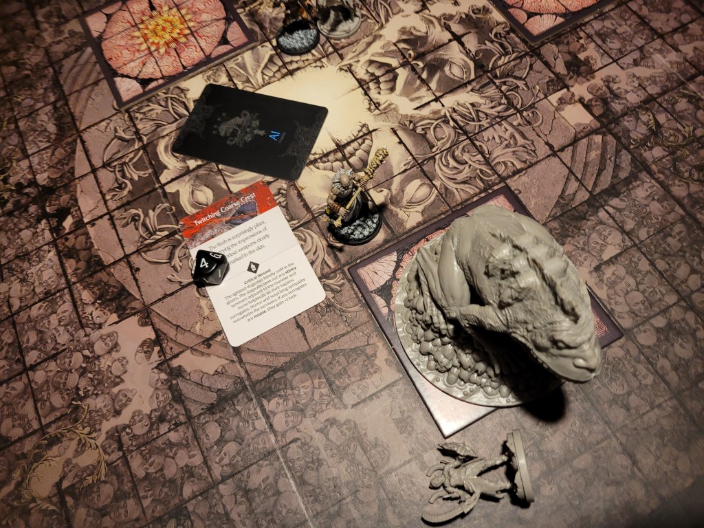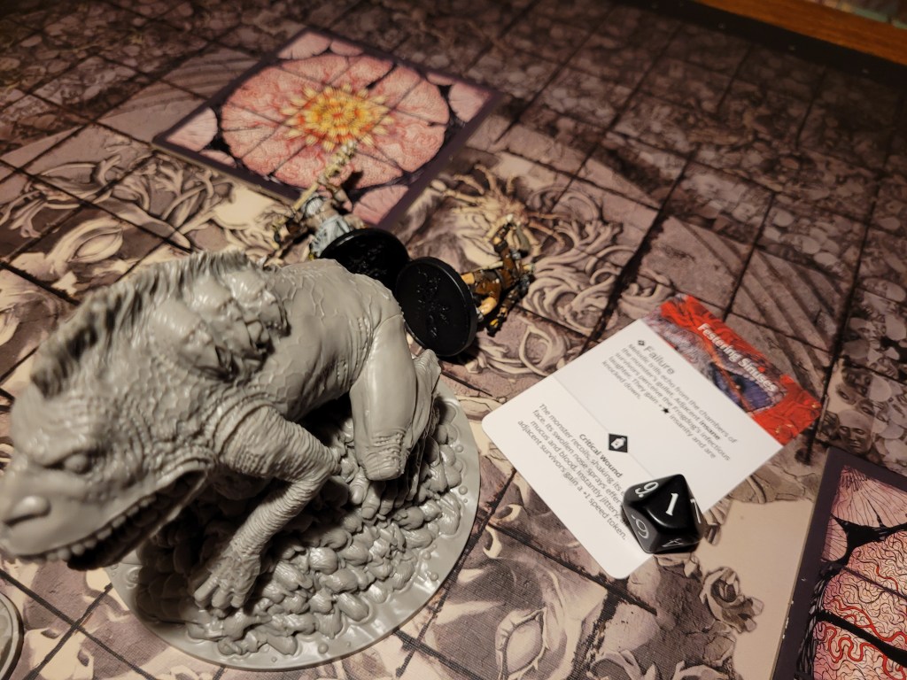 At least the frogdog was close at this point, only one more large open area filled with Skeletal Bloom to cross. Of course Mars ate one of them. Why wouldn’t he? Chance of head explosion..? Oh.. His jaw got blocked instead and the +1STR-token would serve as a survival even.