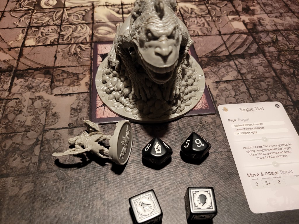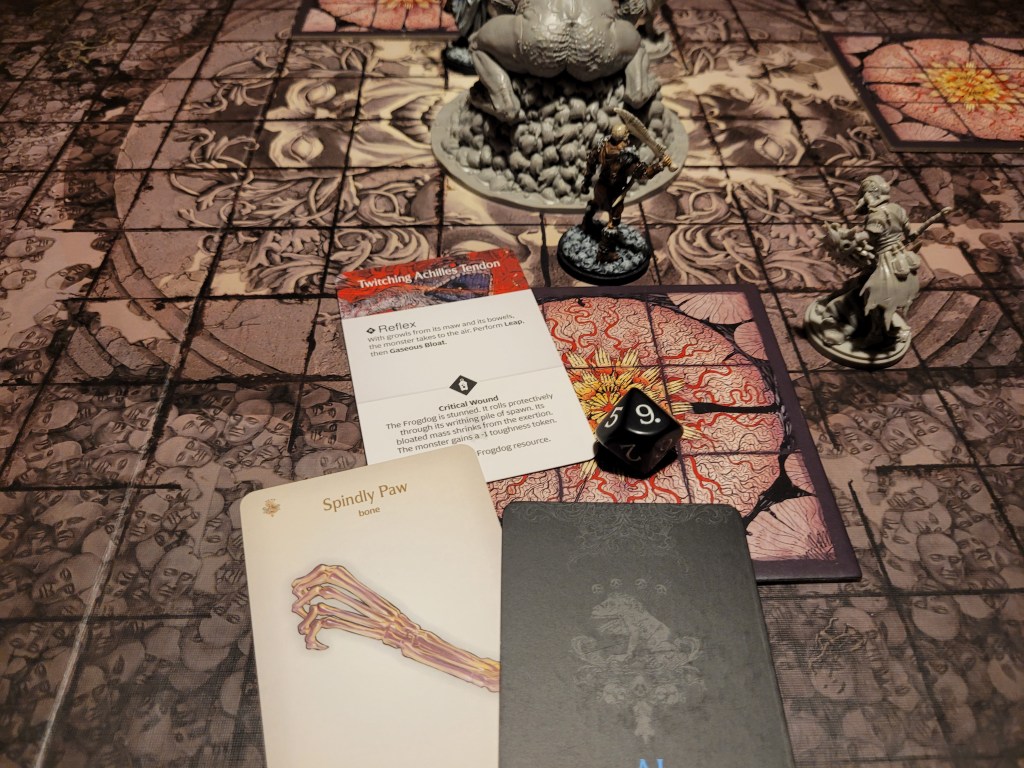 The Frogdog on the floor, the time was now! Mars surged and hit to find.. the trap. Jumping up the Frogdog went wild – scoring loads of hits on 7+, ultimately dealing a severe injury to Mars’ body. Luckily his dried acanthus could soak it. With 3 bleeding tokens to his name from the hunt phase, he would bleed out pretty quickly though, should his body come up again.