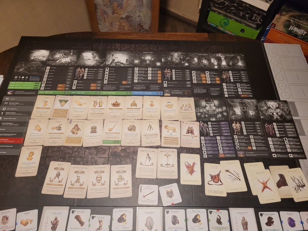 So we made some fresh gruel with the endeavor instead. I spent the fifth and final endeavor rolling on Shrine – getting a 9 and thus some extra armor for all departing survivors. That would hopefully help against the big ol’ fergderg.