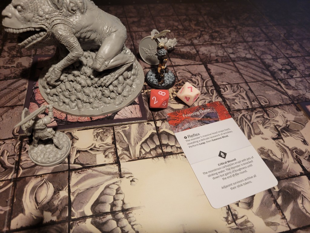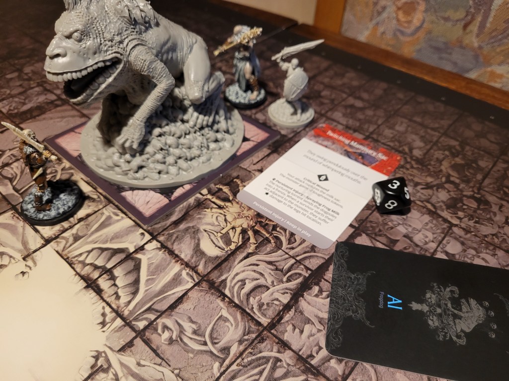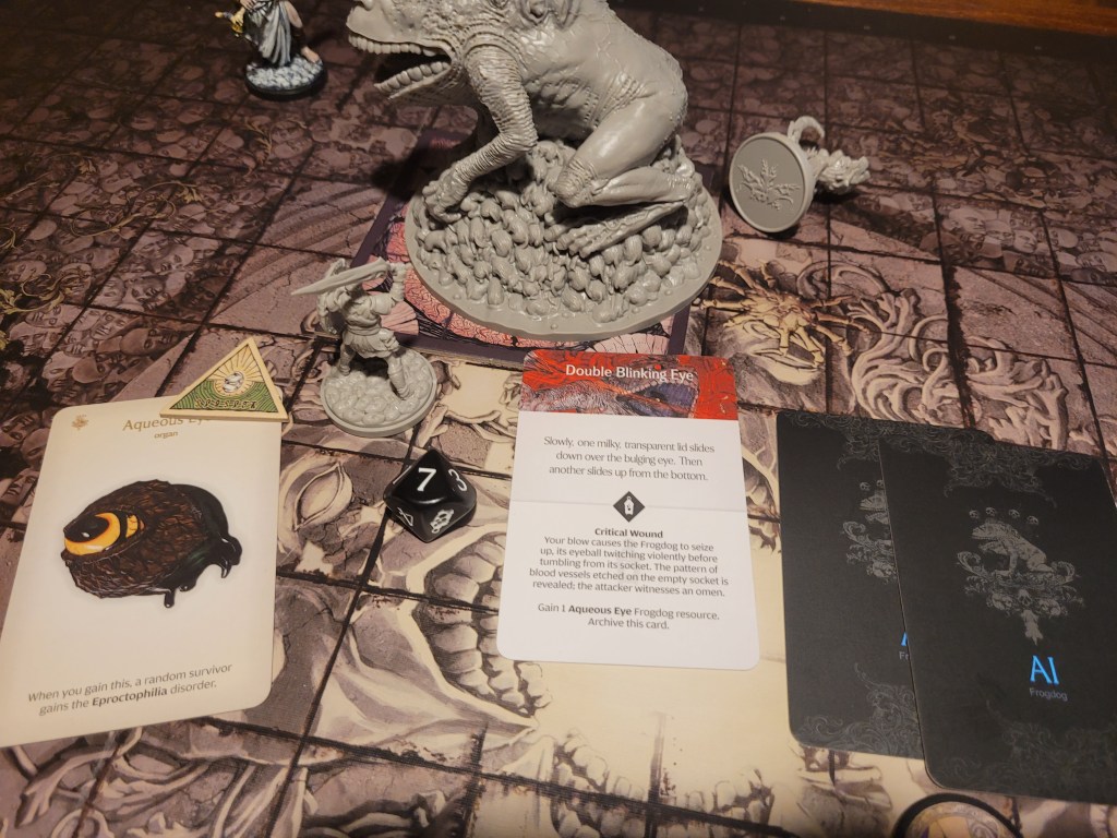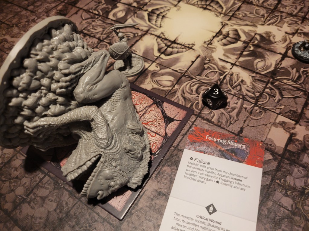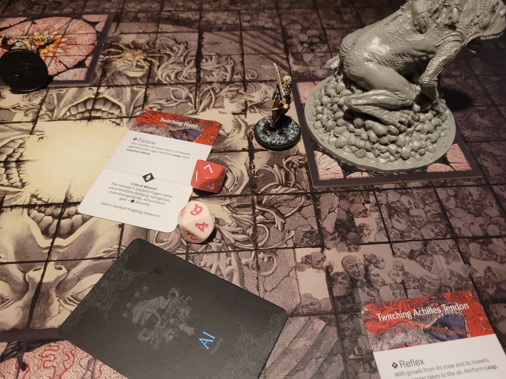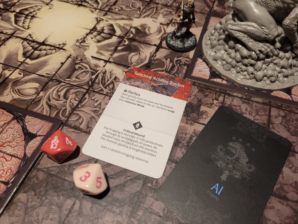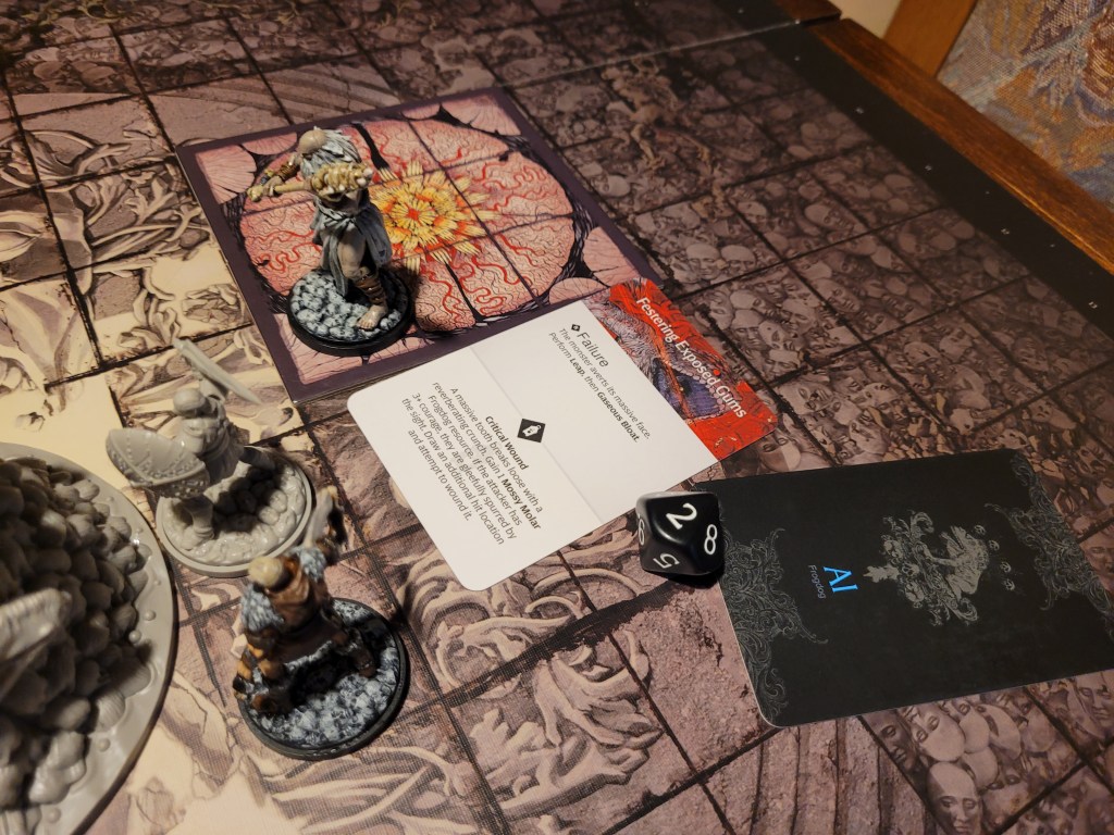 Mars surged and rolled a 4, only getting a regular wound on his follow up. Which I felt like it was a good thing, if I was remembering correctly the event leading to Sad Frogdog Song would offer a reasonably high chance of killing him. Finally, Mars used his leather boots to take a step away.
