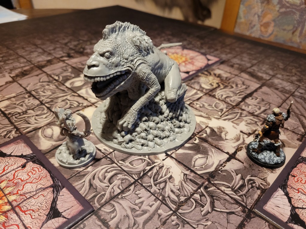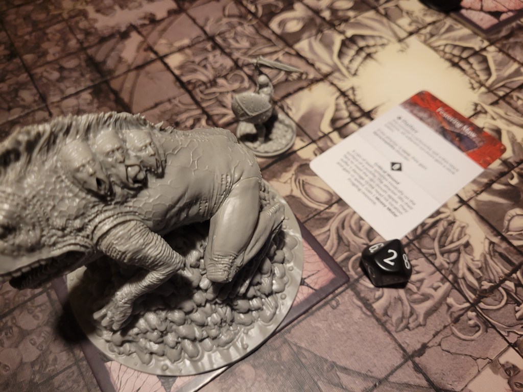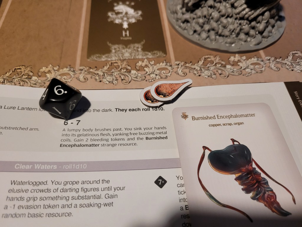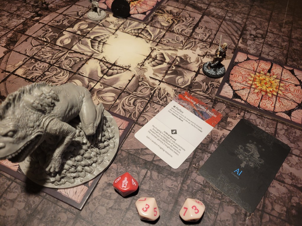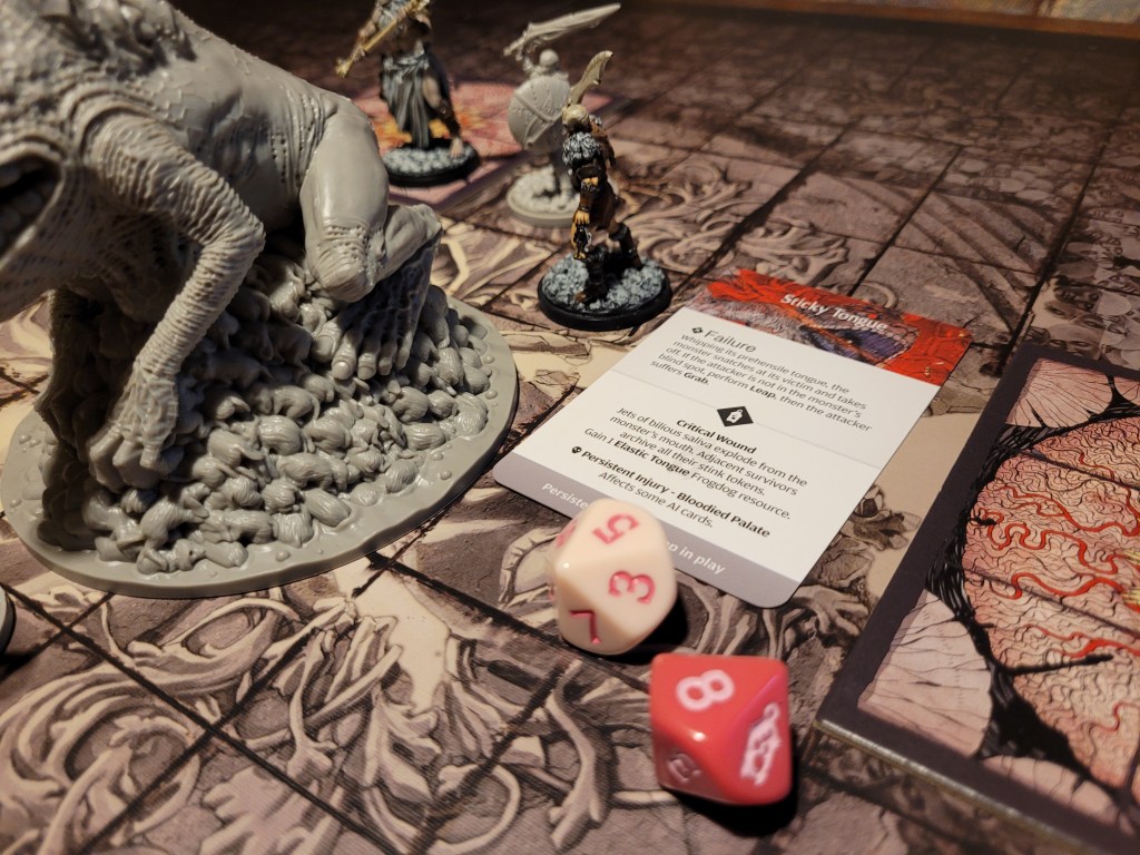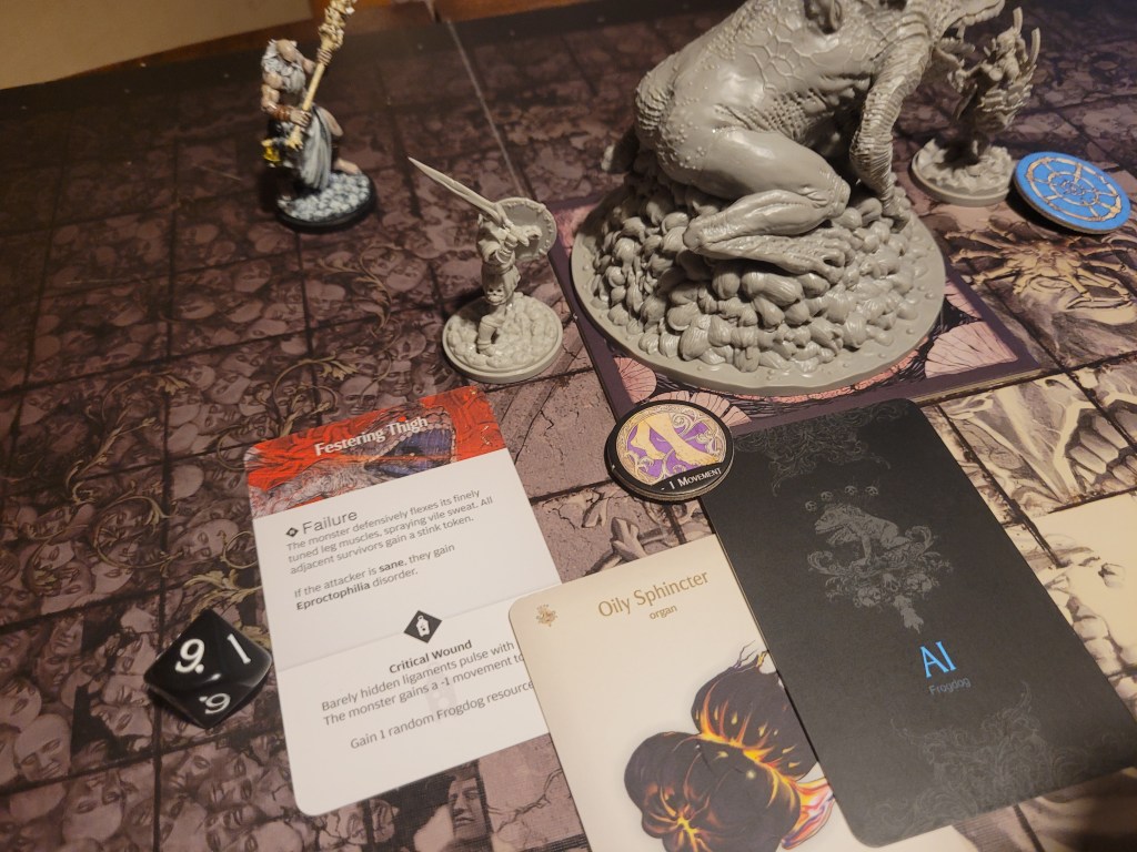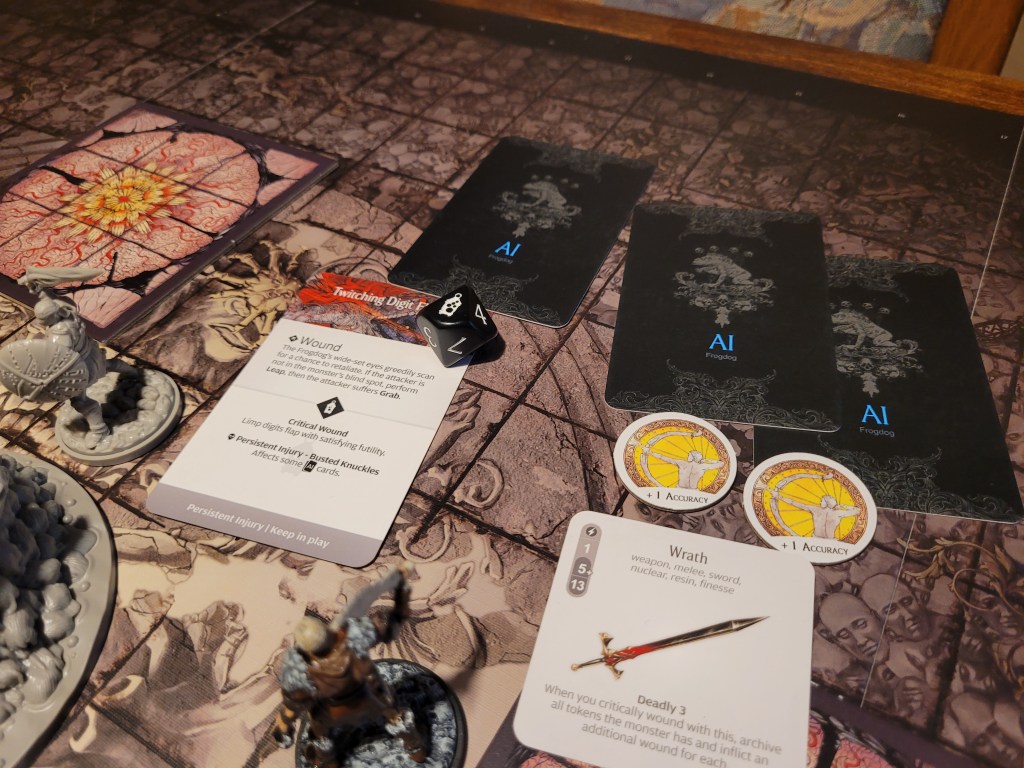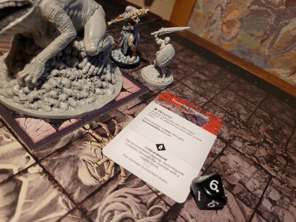 Mars surged and rolled a 4, only getting a regular wound on his follow up. Which I felt like it was a good thing, if I was remembering correctly the event leading to Sad Frogdog Song would offer a reasonably high chance of killing him. Finally, Mars used his leather boots to take a step away.