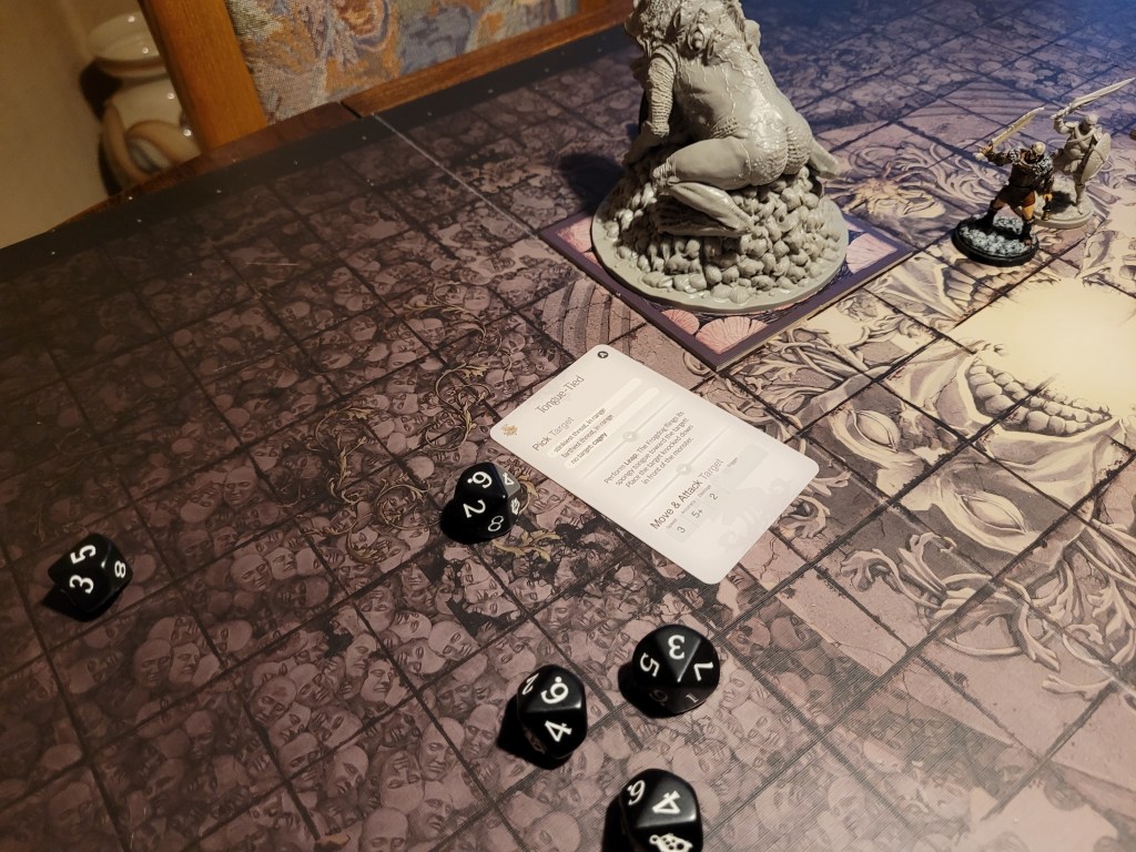 By doing it this way, Mars was just able to reach the heinous origin with a dash. The attack struck true and he even cut off the beast’s tongue! This got us the elastic tongue, 2 wounds thanks to the token and removed all stink from Lelia as well! Mars followed up with a surge – as was proper – and another crit – this time to the Festering Thigh! This added a -1MOV-token to the monster as well for next time and we had taken out both farts as well!