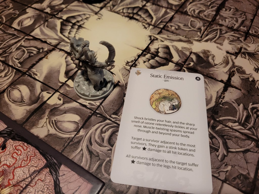 10 (11) cards remaining, 2 farts were going to go off. Sir Hermes was wearing the frogdog headpiece, aka the gasmask, so there was a 50% chance for him to just ignore them. The first fart was Static Emission. Thanks to Mars’ leather boots we were all spread out, so the double hit had been avoided and Lelia, with her minimum of 6 armor across her hit locations, just tanked the 3 damage to all. The 2nd fart turned out to be the Inviting Emission, also targeting Lelia because she was the furthest away. Huh. She stumbled up close to the monster and gained priority target for the upcoming attack!