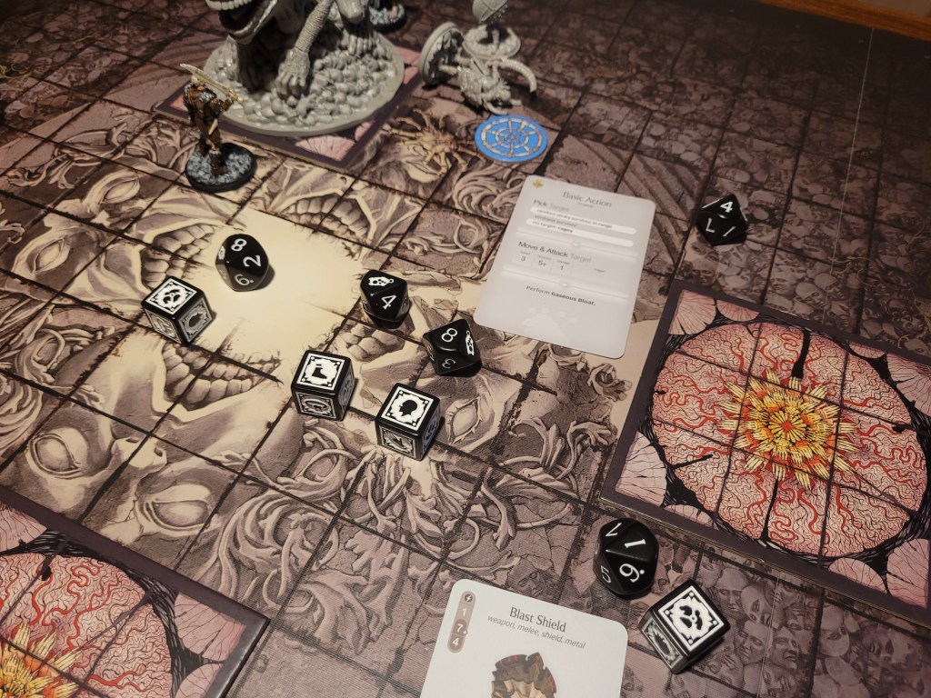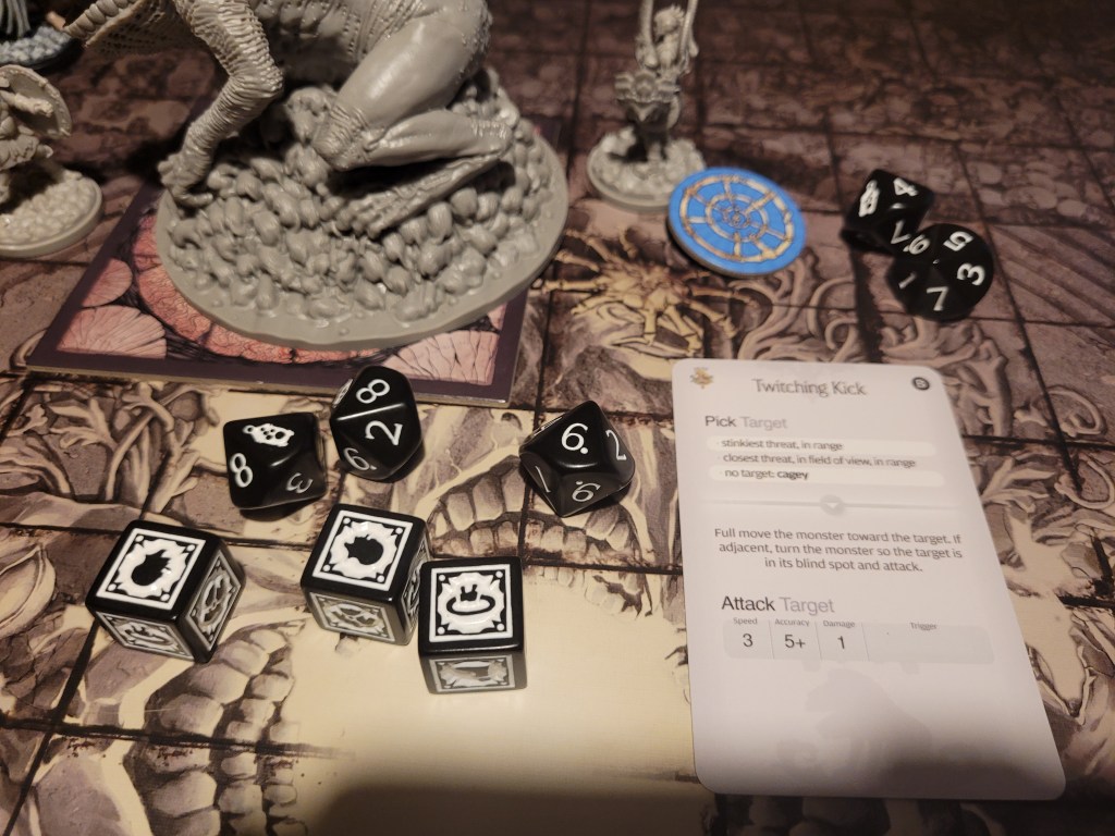 Mars dashed on over. A perfect hit. And a wound on 2. The last AI gone aside Indigestion. He gained a stink token and surged. Another hit. This could be it! A 3 was enough to wound! The monster fell just before I would need to shuffle the farts.