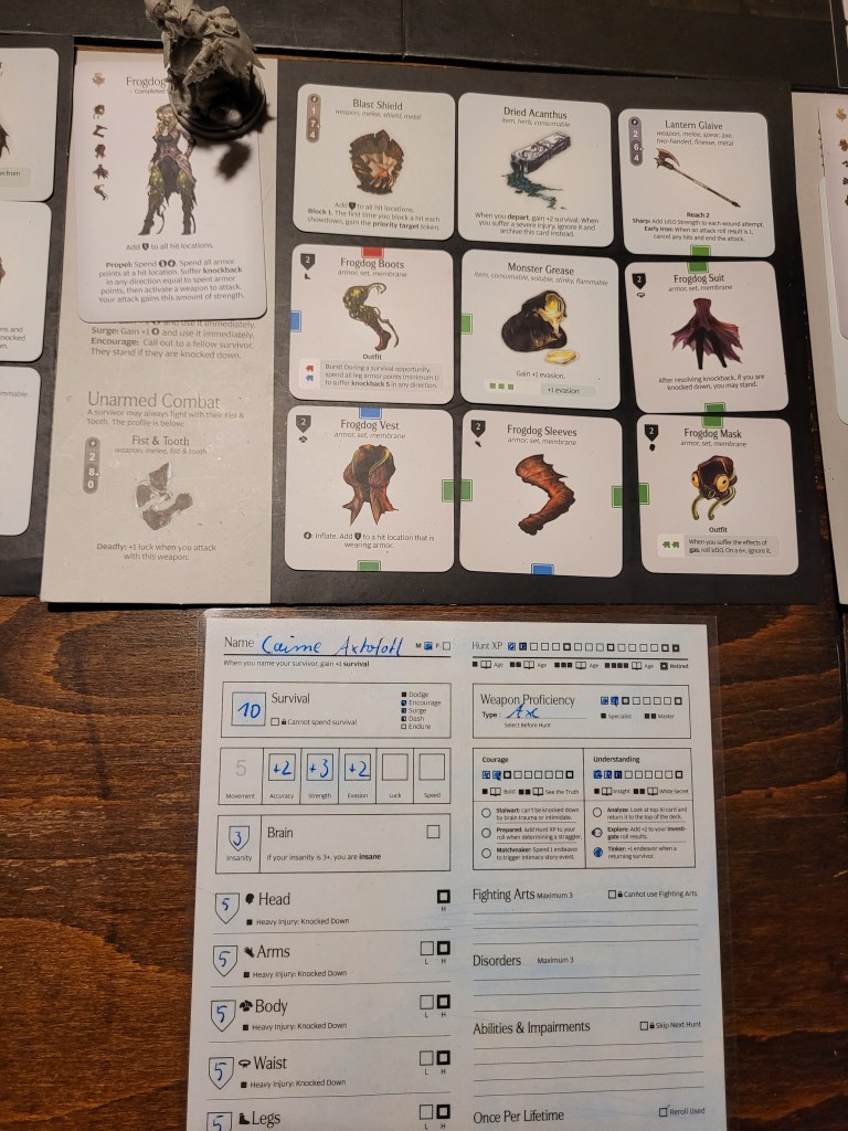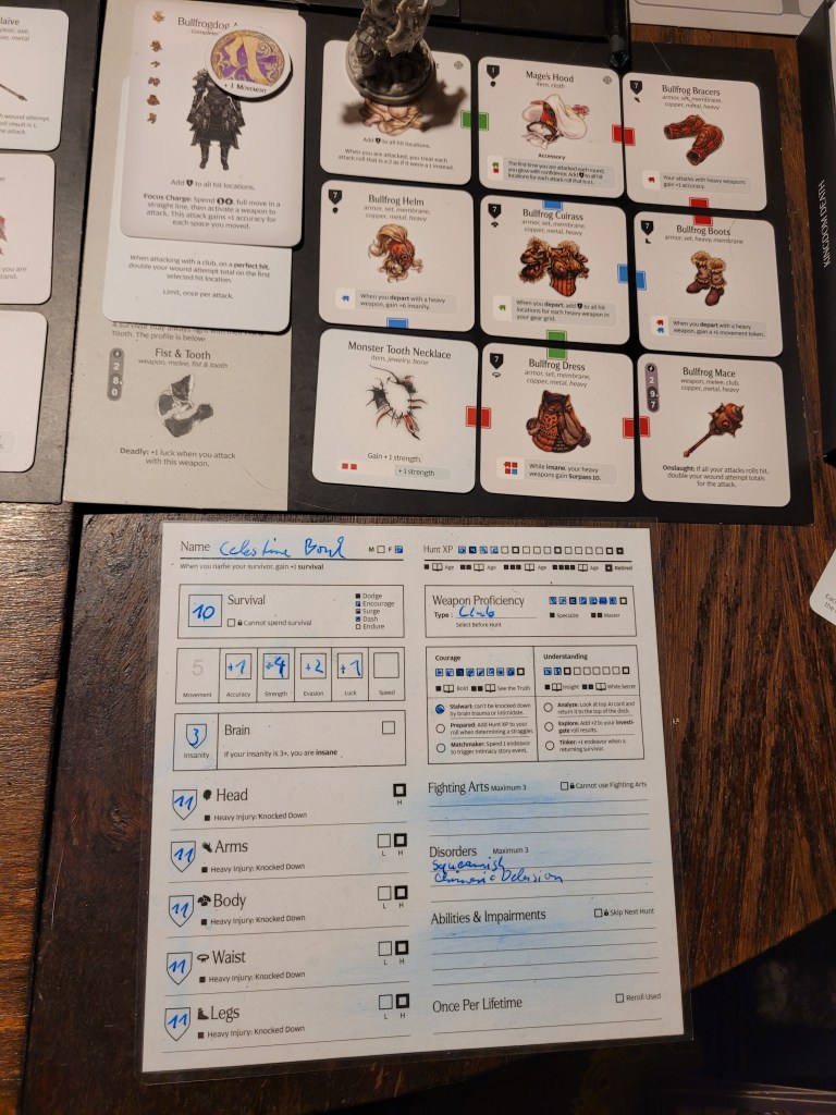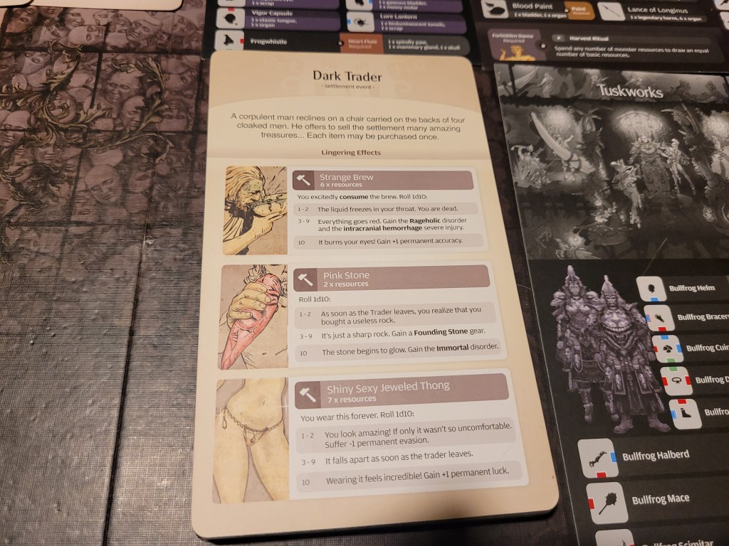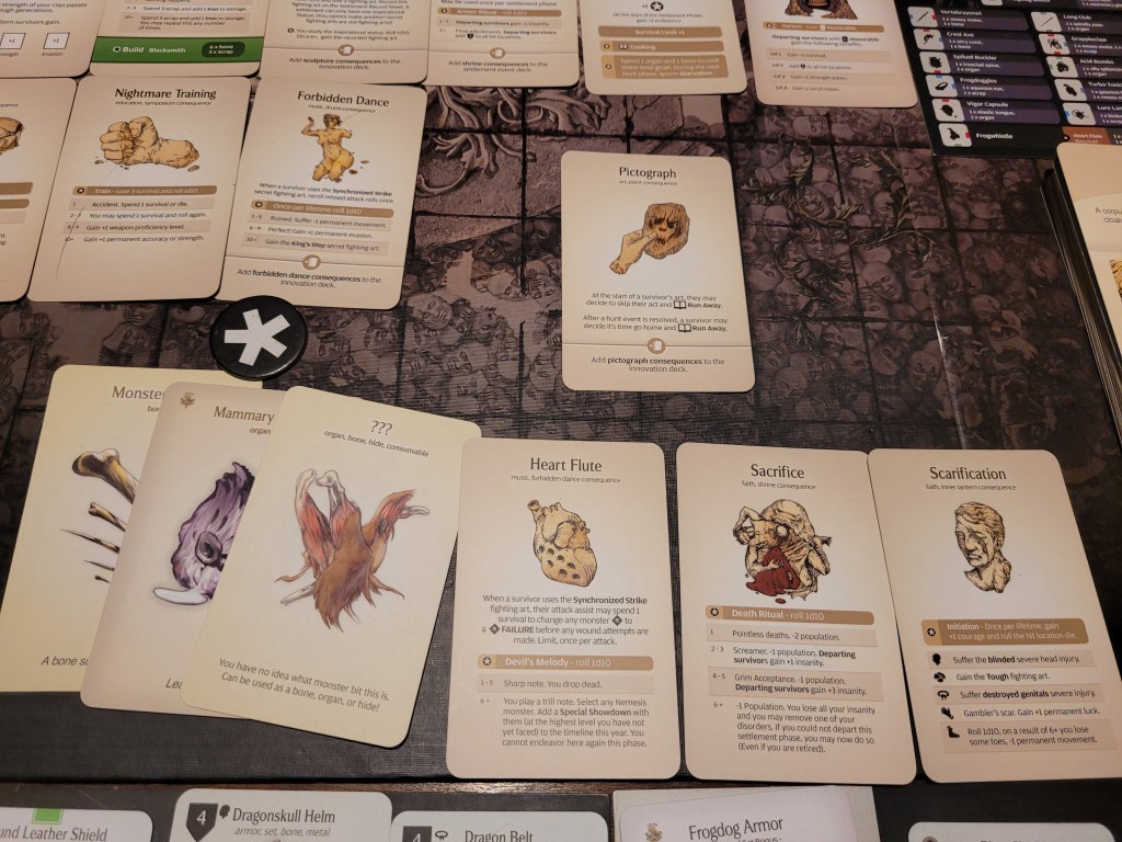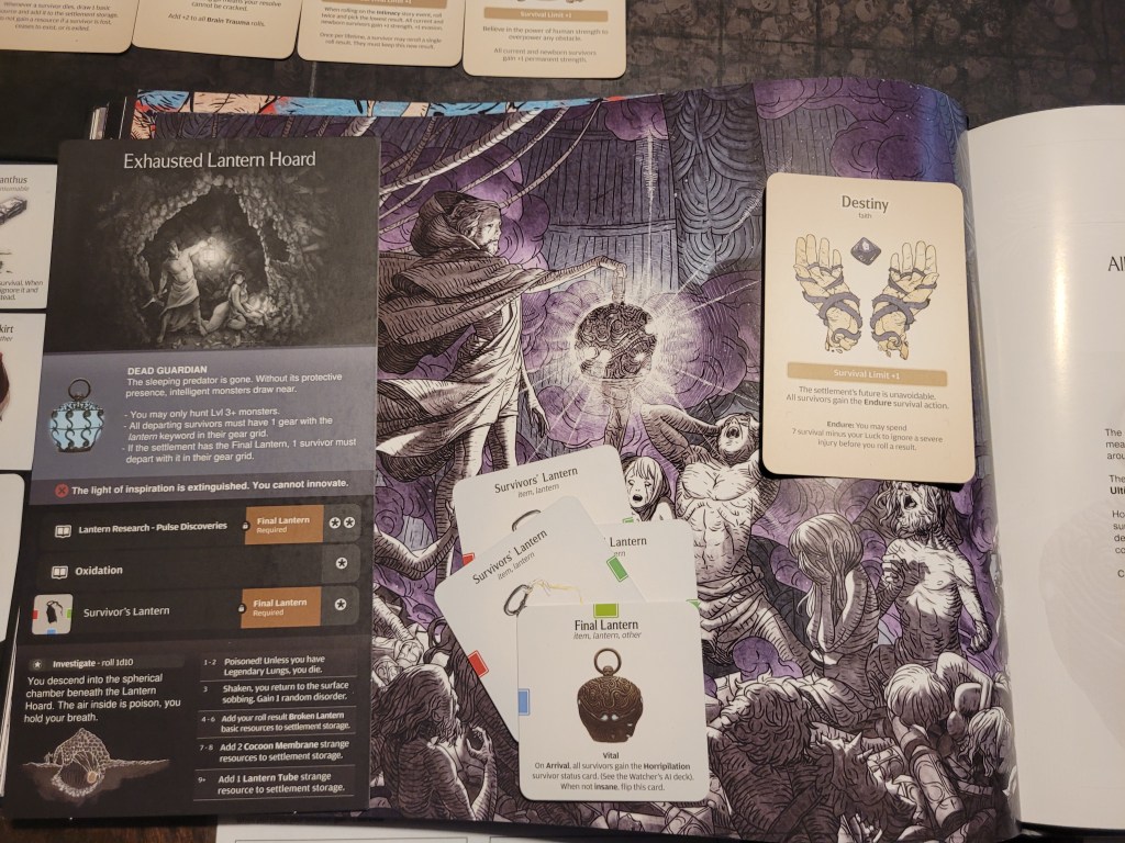 As all the lanterns in the settlement were snuffed out, our Barbaric Spirit faltered and we lost our Ultimate Weapon (I) in the face of utter hopelessness. But even so, we would remain! Spirits rekindled, the settlement gained Destiny instead, unlocking our final survival action, Endure (spend 7-LCK survival to ignore a severe injury before rolling for a result).The Exhausted Lantern Hoard further meant that we were no longer able to innovate (which we did plenty however, even if we never got to pottery) and that we were limited to only hunt Lvl3 monsters from now on.