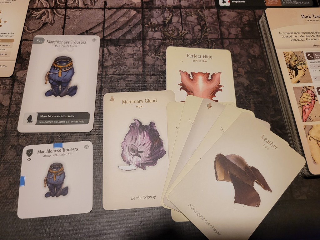 With all the pleasantries out of the way we got done welcoming the guest and got to the important stuff – building the rest of our Bullfrogdog Armor Set. We still needed the helm and pants/dress (though we could have substituted the Bullfrog Helm with the frogdog helm gasmask). So we began by assigning 1 endeavor to leather making.