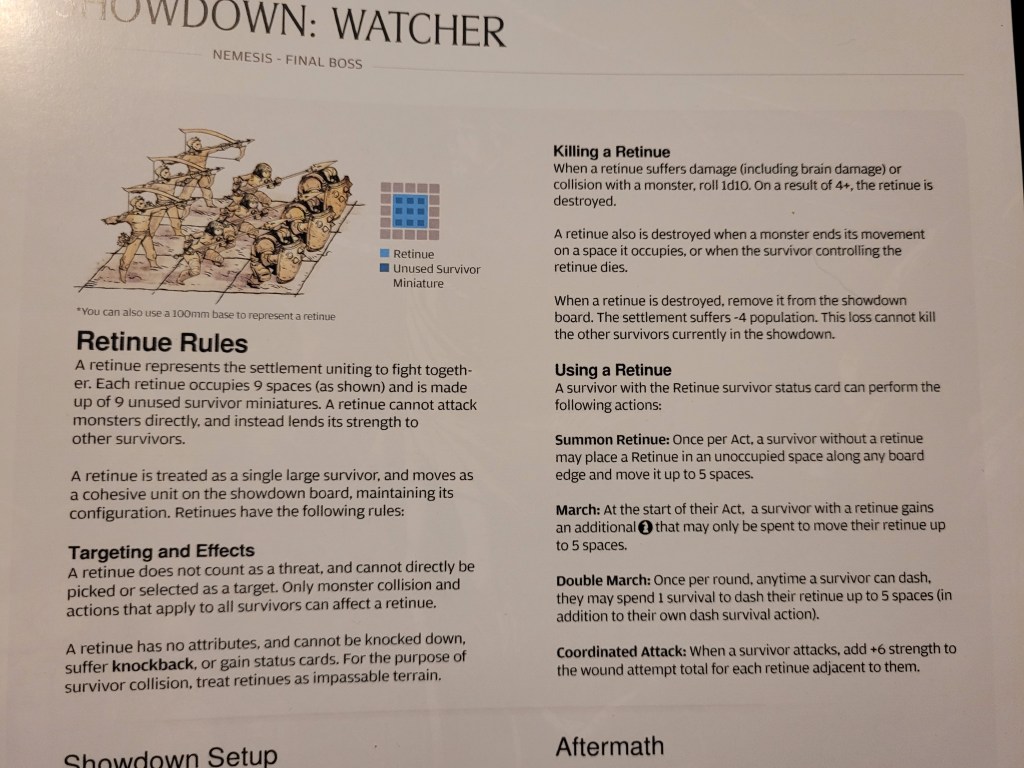 Retinue and the Twilight Sword are the other two big beneficial effects influencing this fight. A strong Twilight Sword user can kill the the Watcher in as little as 5 hits as the weapon deals 3 wounds instead of 1 specifically to Watchers each time you can slip past its defenses, whilst Retinue adds the ability to summon blocks of 9 survivors to help out in the fight. They get scattered very easily though, potentially killing 4 people from the settlement each time this happens. However, a Retinue also add 6STR to any adjacent survivor, making wounding the monster very easy with the right positioning. Turns out, under these circumstances, 21TGH isn’t really that big a deal.