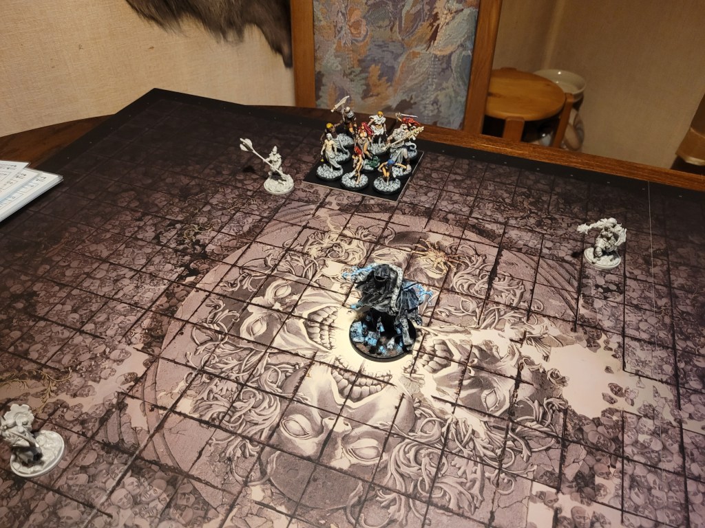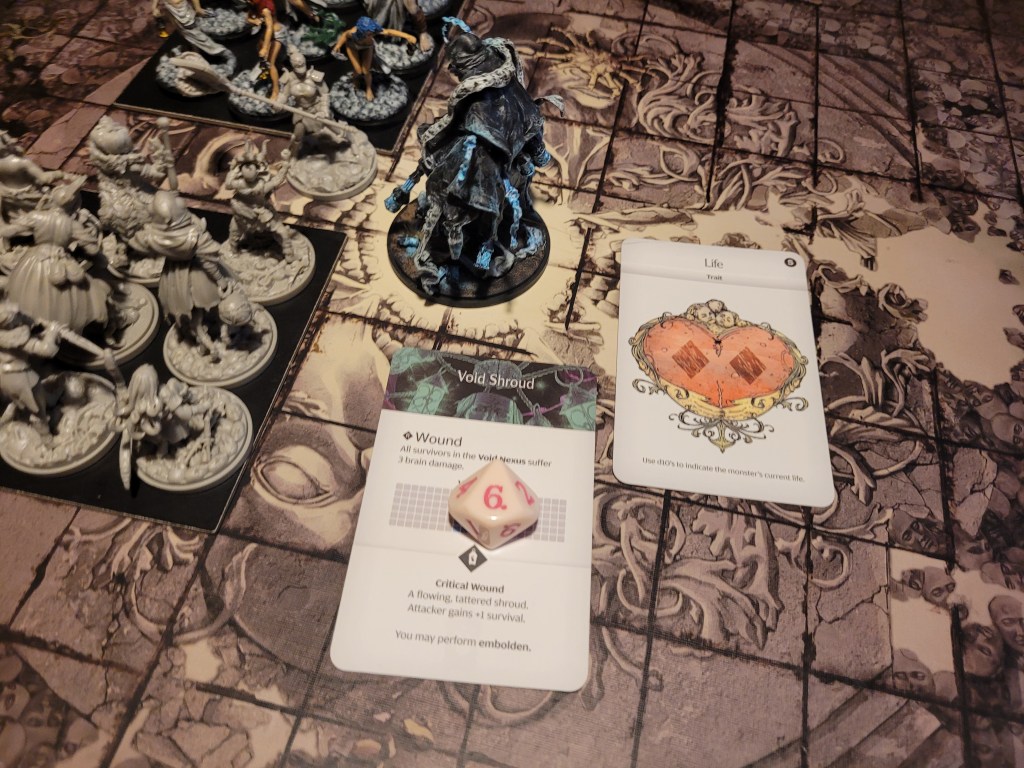 Ghurt was encouraged (he was knocked over by the trap) and he summoned a retinue of his own, setting up a lane for Selen to attack in. She dashed into the monster’s blind spot and saw her destiny unfold before her. With nothing left to do but hope – she attacked. She only hit the Watcher twice (with 3SPD on 2+) and wounded on 2+ (9STR from the sword + 12 from the retinues and 1 from her). She wounded both the Void Nerve Mask, dealing 3 damage to the monster and the Hydrostatic Fluids, dealing another 3 damage as she took a Bleed token in return.