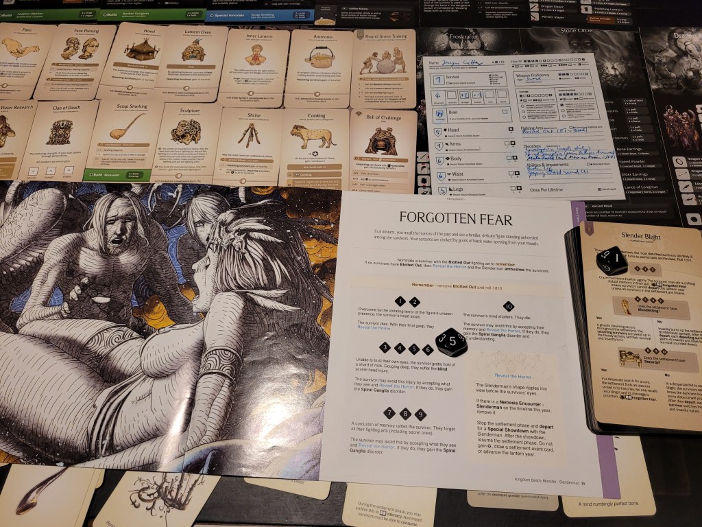 Jerryn was the one to bite the bullet. I DID NOT want to fight an extra Slenderman at this stage. So, the only thing left to do was for Jerryn to blind himself in a horror-movie-esque attempt to chase away the cruel vision of something unrememberable (a 5 on Forgotten Fear).