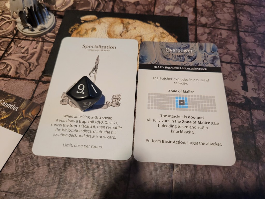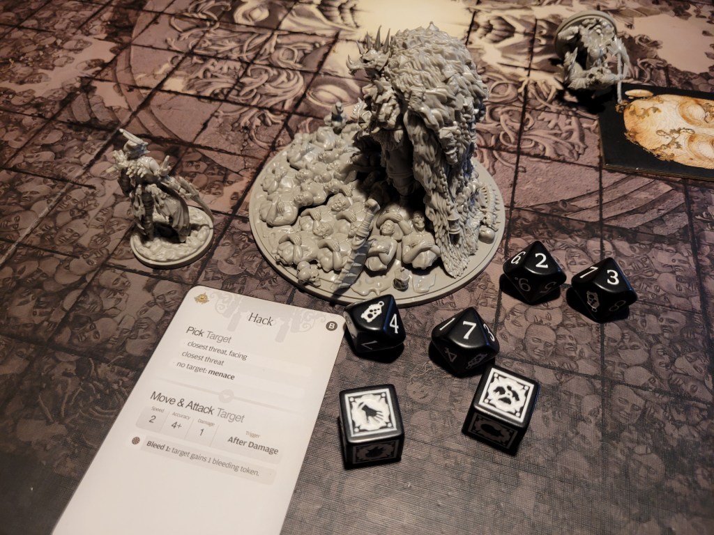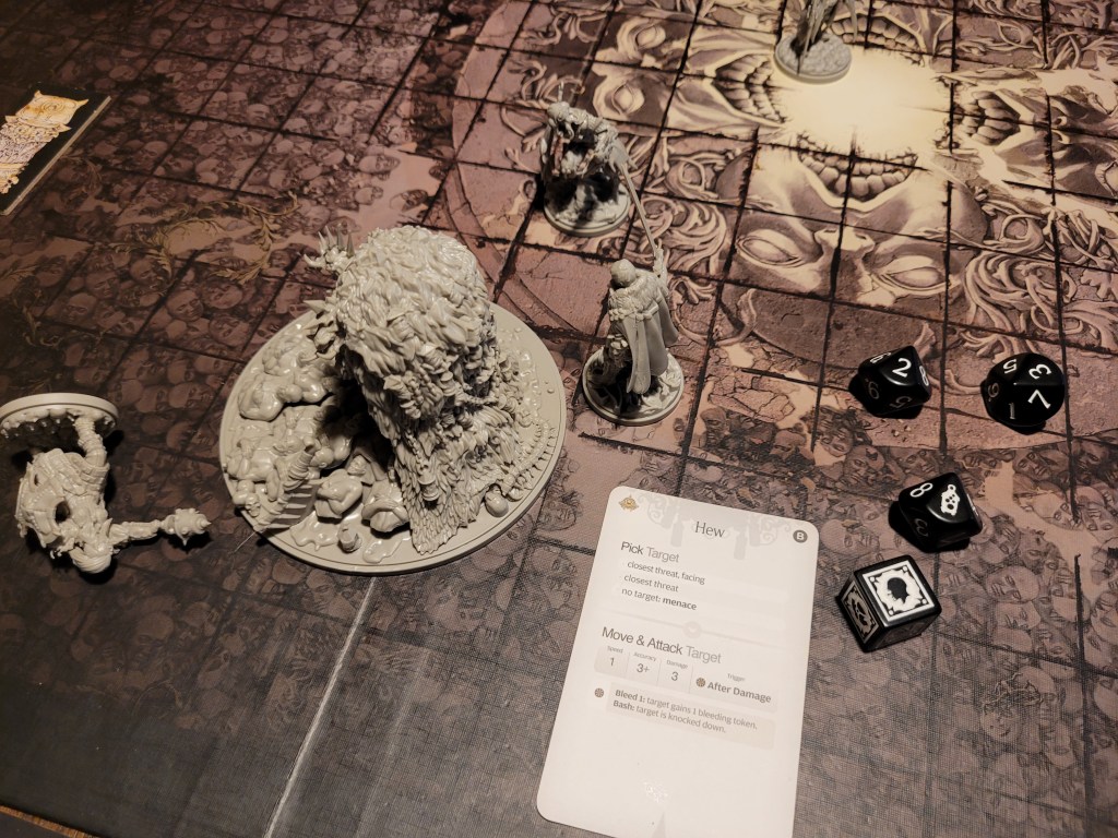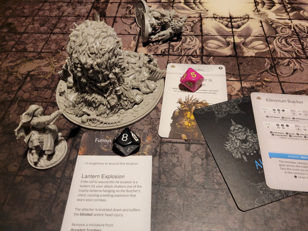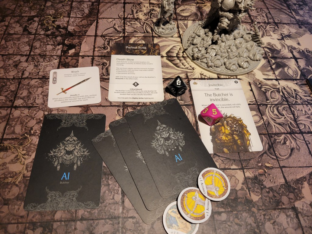 It gains the Butcher staple trait Berserker, meaning it will draw 2 cards per turn and it is, of course, Invincible. Ugh. On an 8+ his rage will just soak the wound(s) we potentially dealt with any one attack. This remains to be the one trait I have encountered that I just can’t stand. For weapons like Wrath, or huge hits with a club, only the initial wound will be looked at by the trait. So it takes either all the potential wounds the hit caused or none.