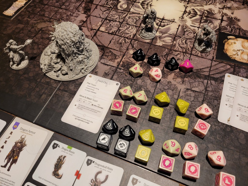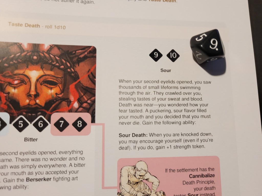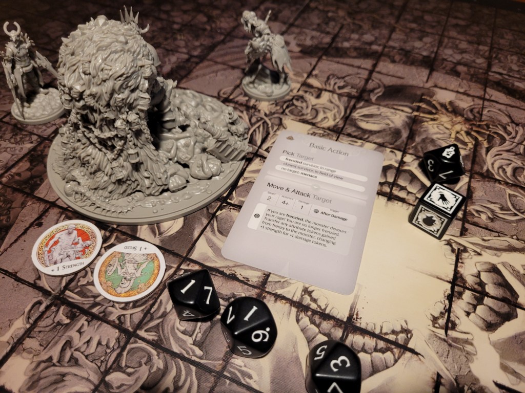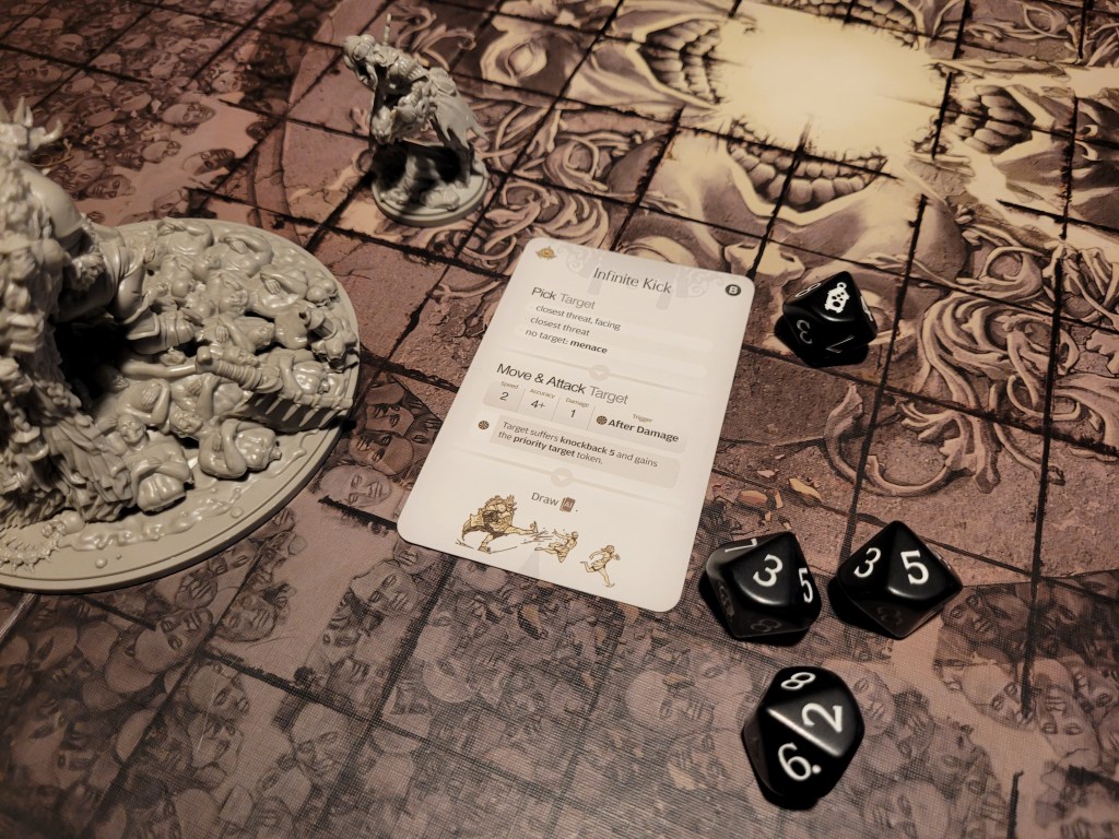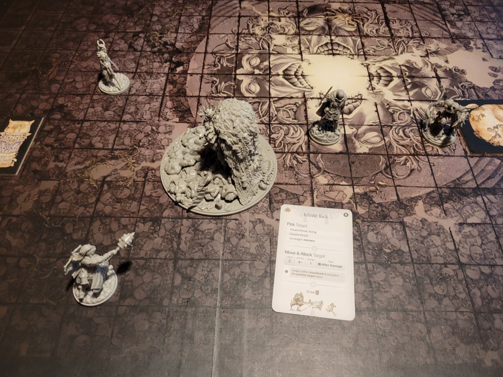 It gains the Butcher staple trait Berserker, meaning it will draw 2 cards per turn and it is, of course, Invincible. Ugh. On an 8+ his rage will just soak the wound(s) we potentially dealt with any one attack. This remains to be the one trait I have encountered that I just can’t stand. For weapons like Wrath, or huge hits with a club, only the initial wound will be looked at by the trait. So it takes either all the potential wounds the hit caused or none.