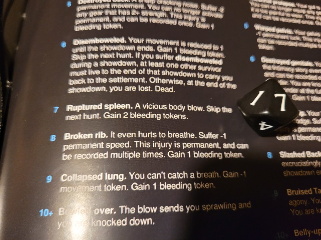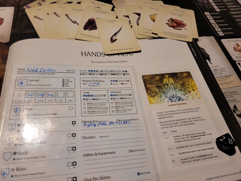 Whether sensible or not, I ultimately decided to do it. He rolled a 4 and survived the flesh being forced into his skull. Healing his broken leg would also been nice, but I faintly recalled additional EVA for the monster. And should he/we survive, Jerryn still had a lot of hunts left he could go on.