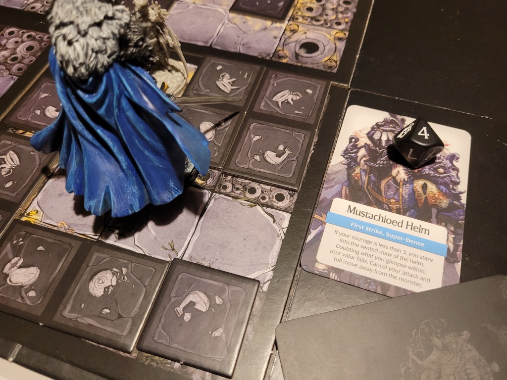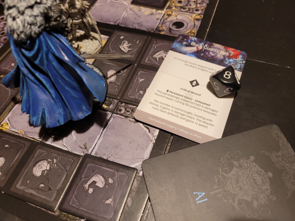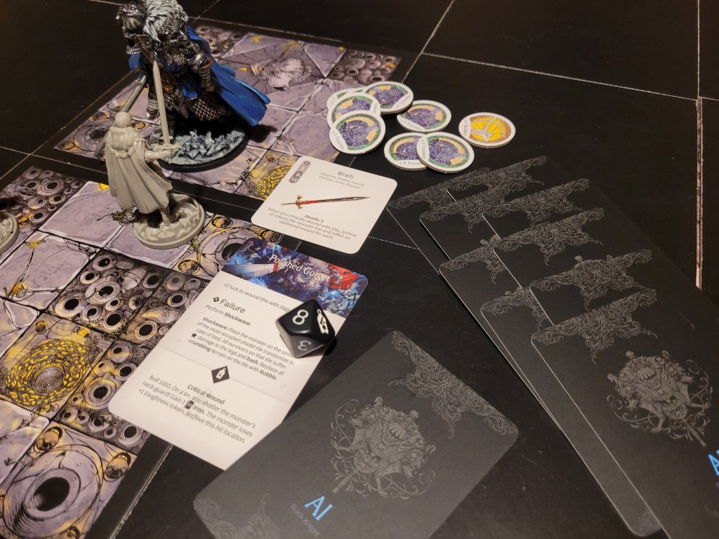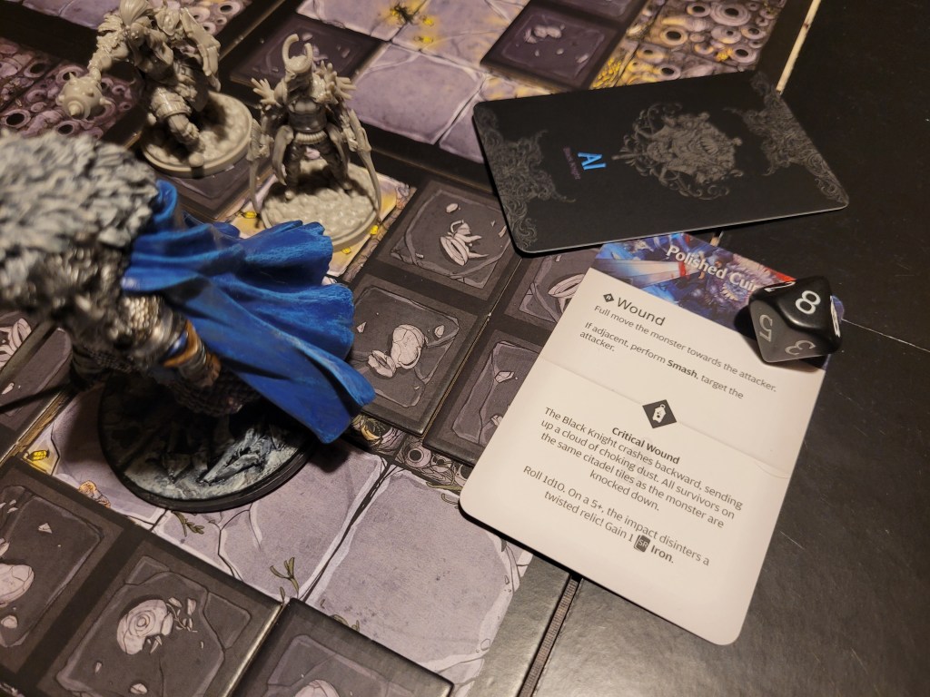 He struck the monster’s Polished Gorget first – there was only room for 1 dog-themed gorget around – and an 8 was an easy crit (on 7+). We did not gain the additional Iron from the crit effect but 10 wounds was a hell of a prize for a first strike.