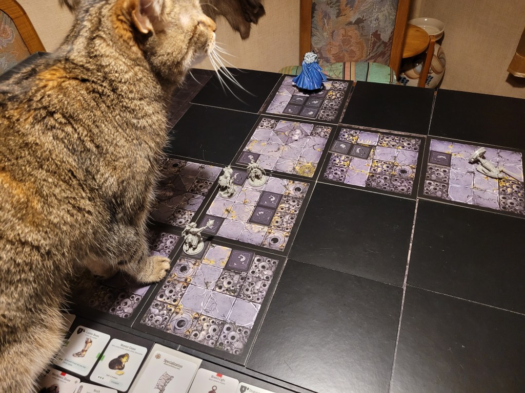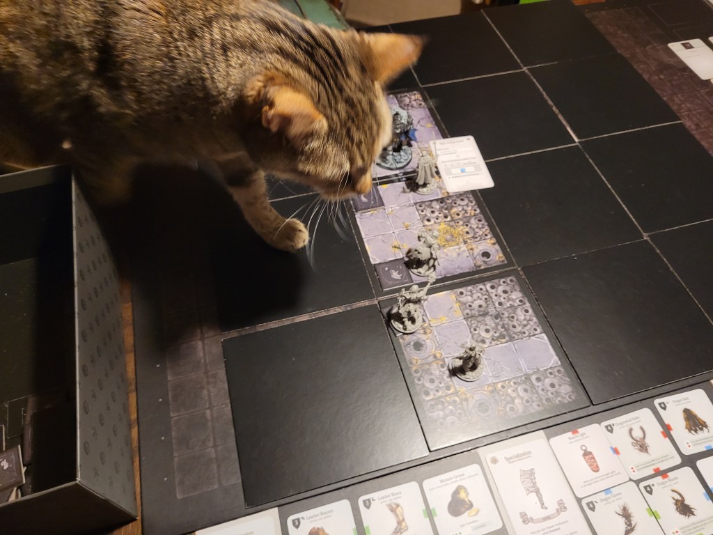 Our turn began with Ruby moving into attack position but the game was stalled as the Feline Entity chose to sit on her gear grid and character sheet. After the enforced pause, she hit the monster twice(!) on 9+. She wounded once before the monster jumped away towards Cleavelette and Celestine, pulverizing all terrain on their tile and knocking both of them down.