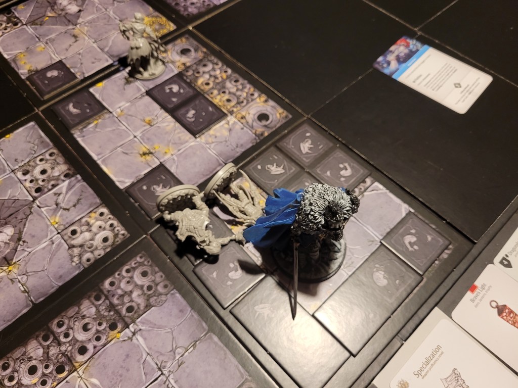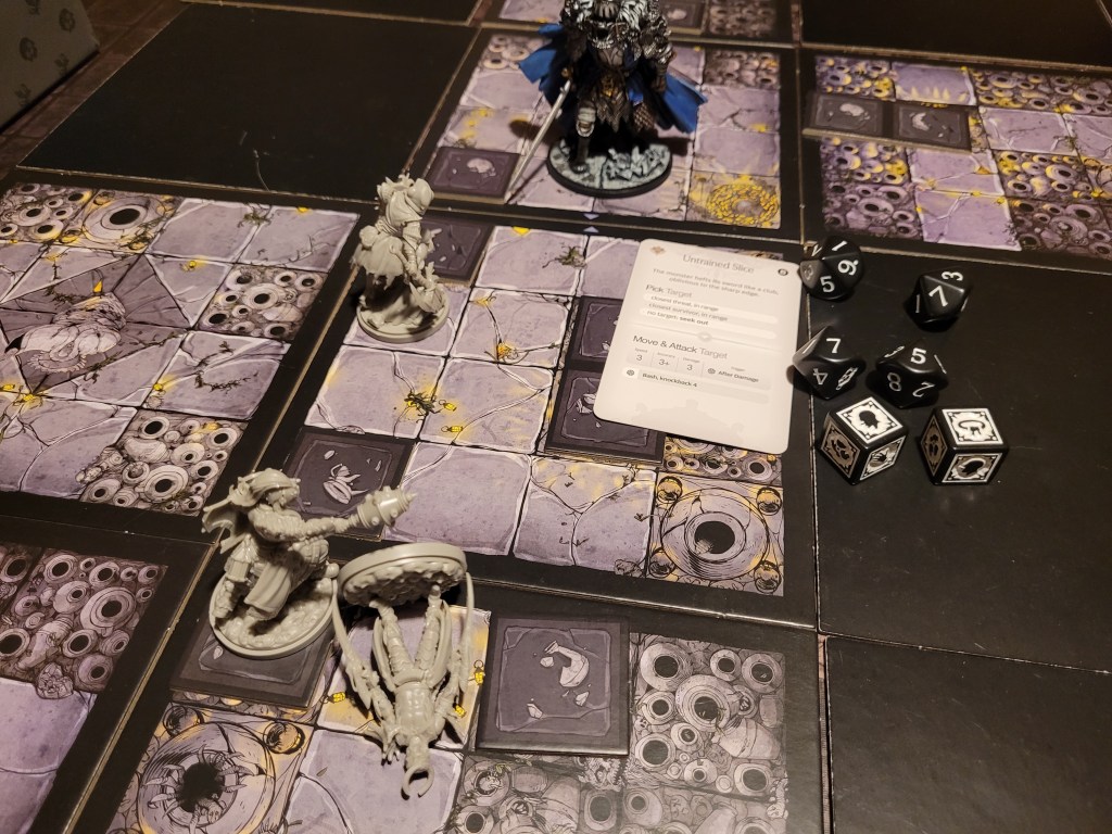 As the survivors activated Cleavette began by helping up Jerryn. He then activated to move back in. He swung again but missed. He surged to deal a wound to the severely weakened monster, but he got hit in return with a basic attack.