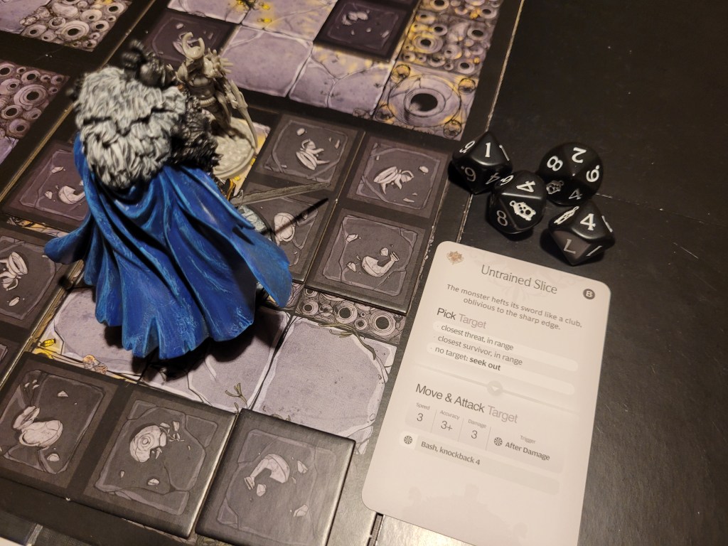 First attack wounded and we ignored the wound reaction again, preventing another Smash. A second wound followed as did a crit on the third! Presented with the opportunity, she spent 1 survival to knock the monster down before dealing the 4th and final wound of the attack.