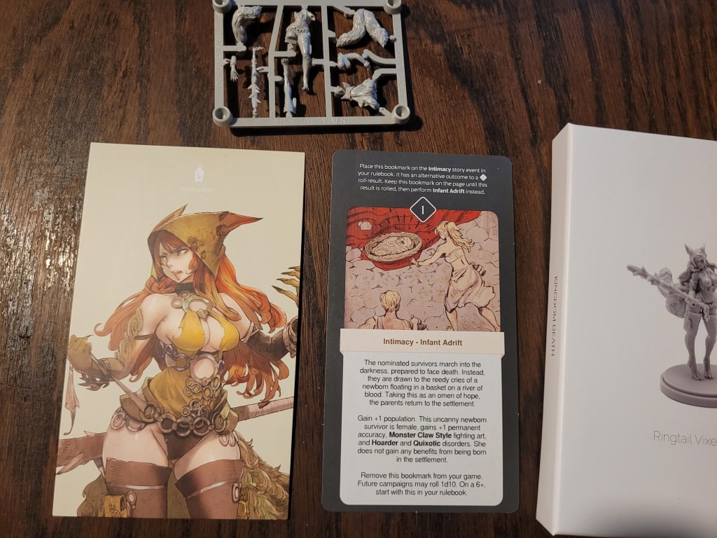 Placed on the relevant intimacy page of your campaign, the first time you roll a 1, instead of losing 2 survivors you gain a special survivor with the Monster Claw Style (FA) instead. The bookmark is then removed for the rest of the campaign and at the start of any following campaign you roll a dice, on a 6+ the bookmark is added to the rulebook, ready to save your ass again.