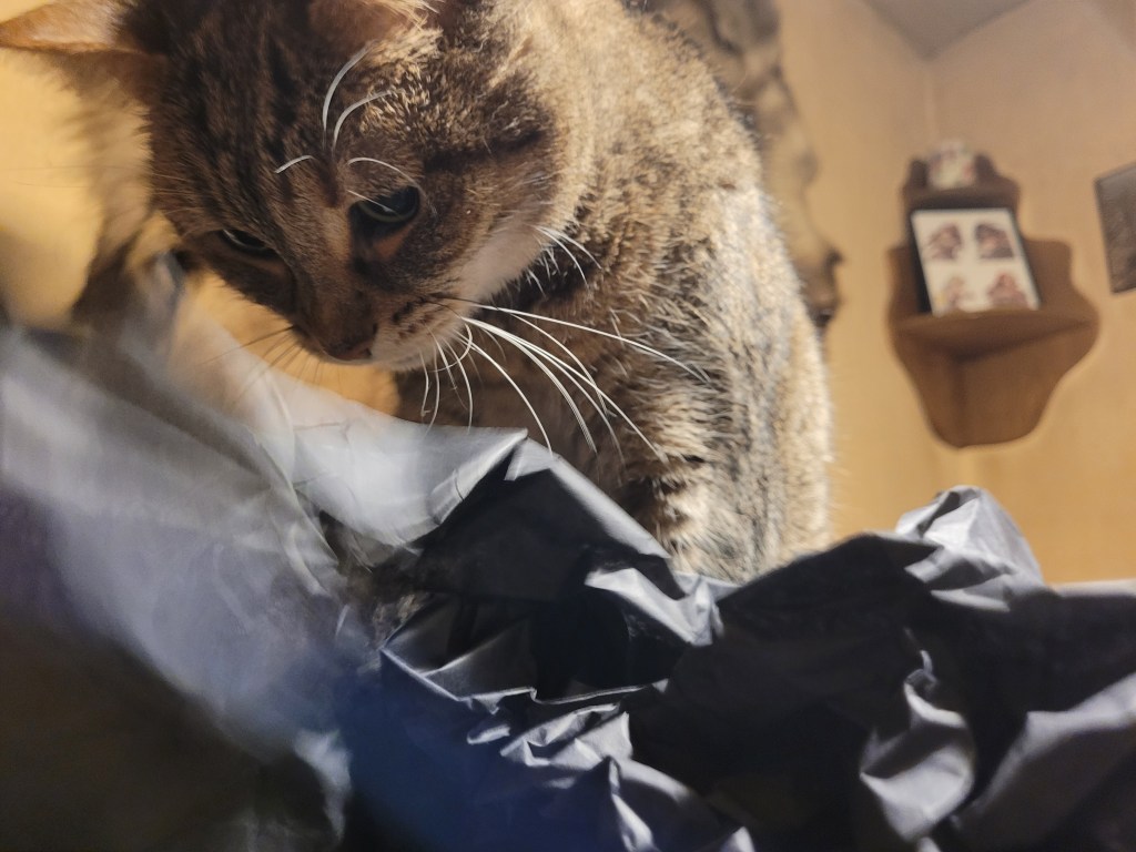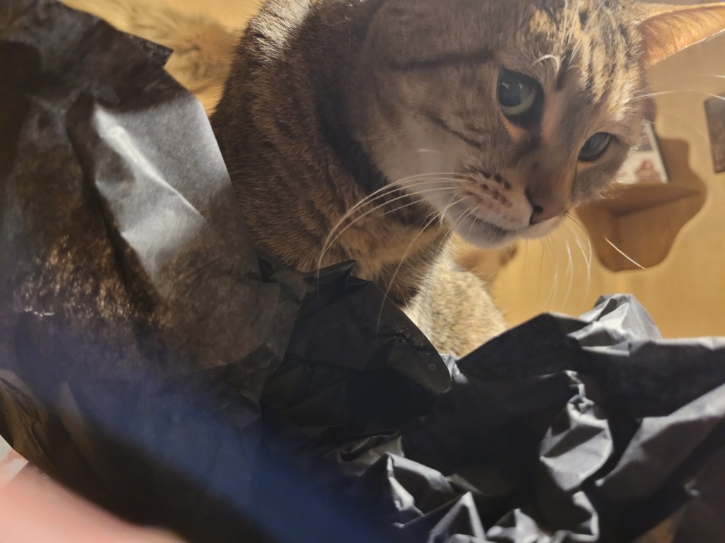With the current month covered, my orders from last month have finally managed to arrive last week, and whilst I can’t seem to find the pictures I took of Kale, I have a few of the Feline Entity helping out, examining the black stuffing paper.
