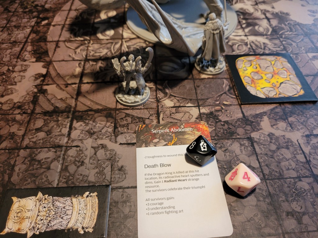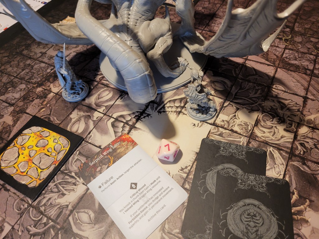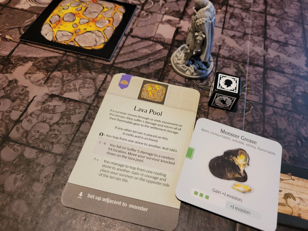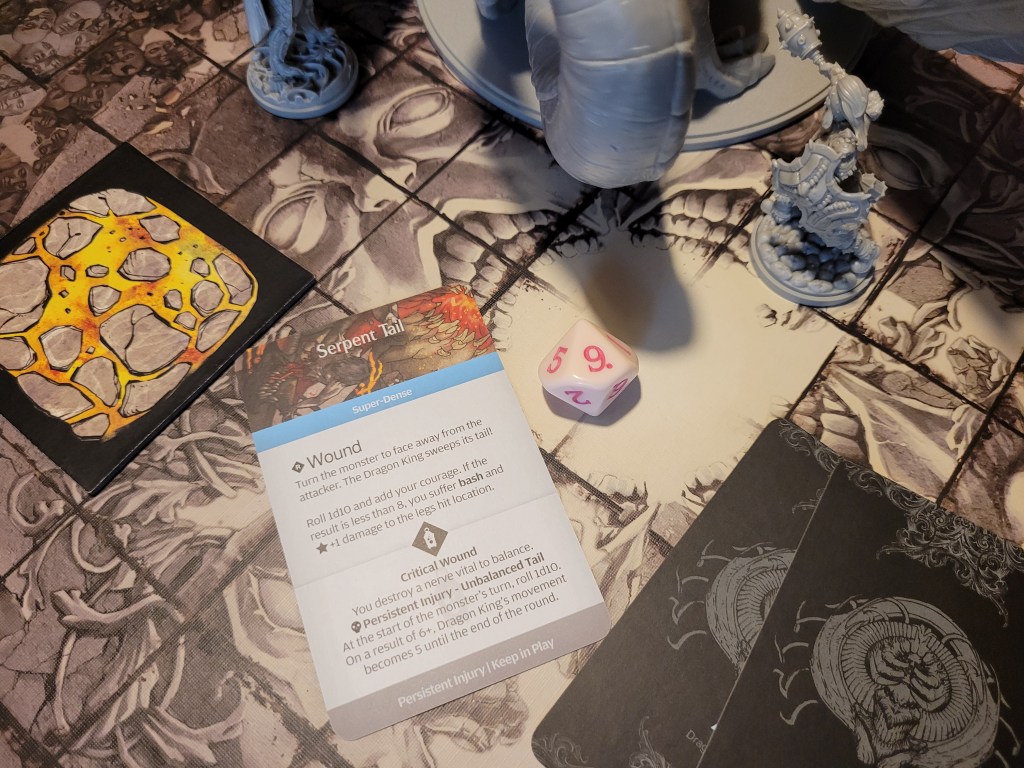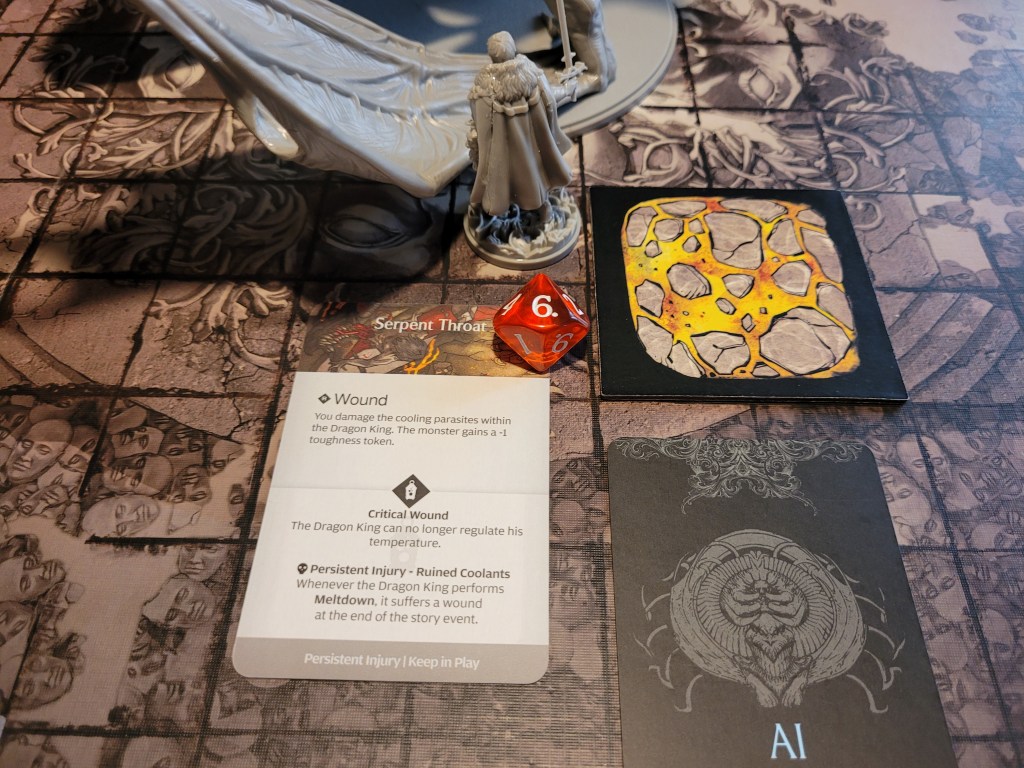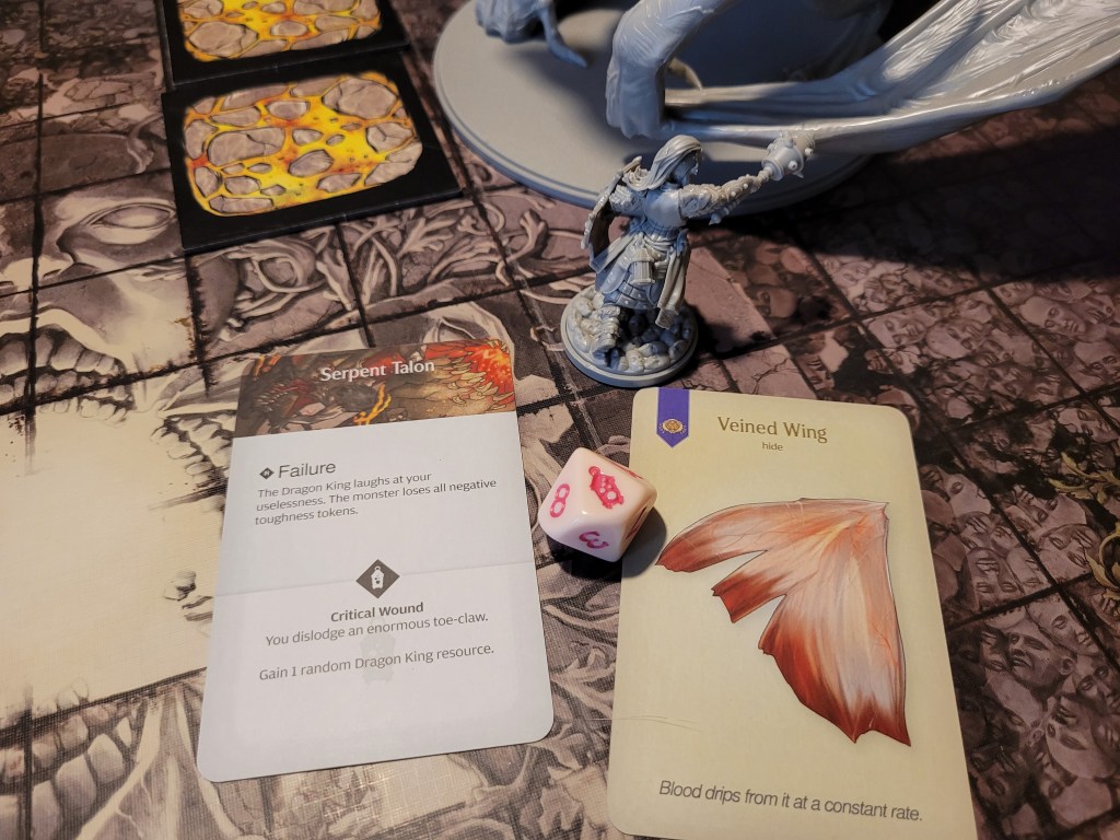 As a sword specialist he rolled first and then determined the hit location. A lantern 10 dealt 3 wounds as it removed the +1LCK and -1TGH-tokens. He also gained a Husk and placed a Lava Pool (T) as the monster’s boiling blood hit the stone ground from carving out a chunk of the Serpent Wings.