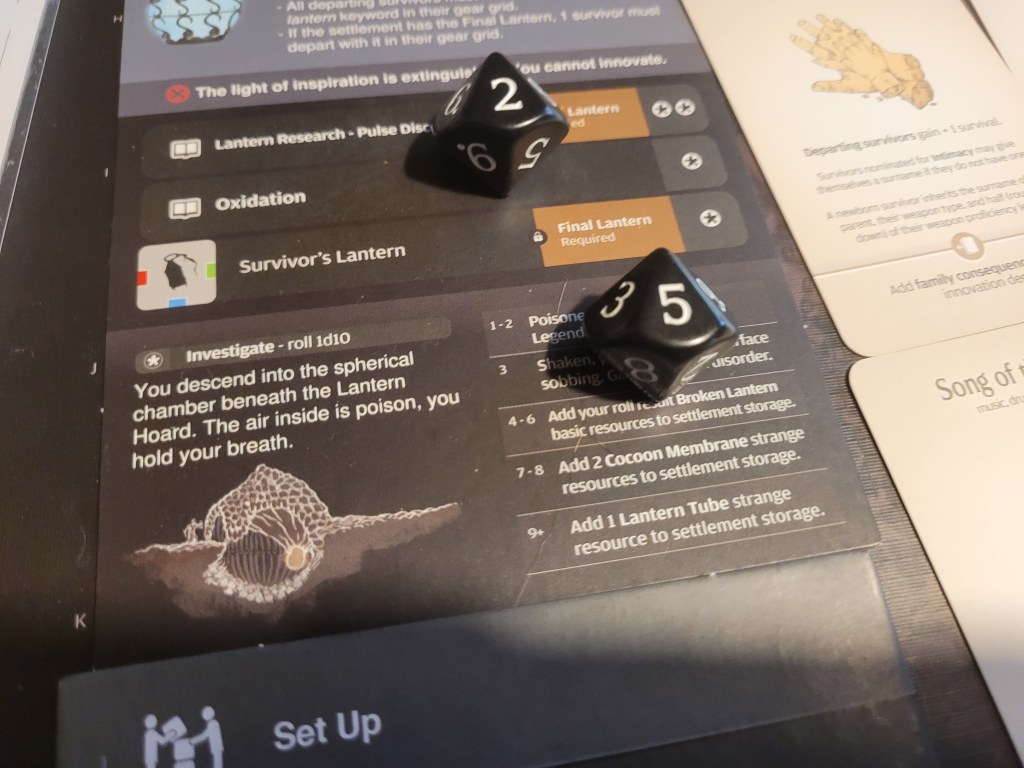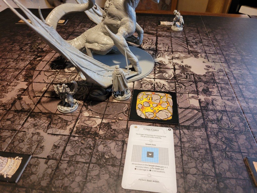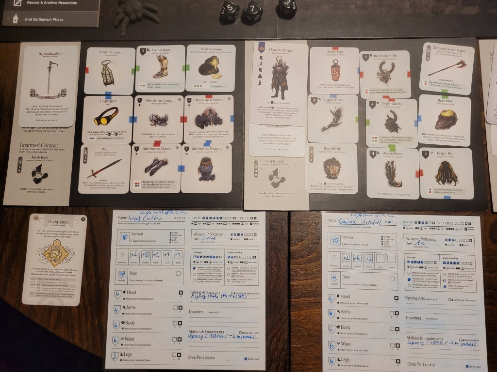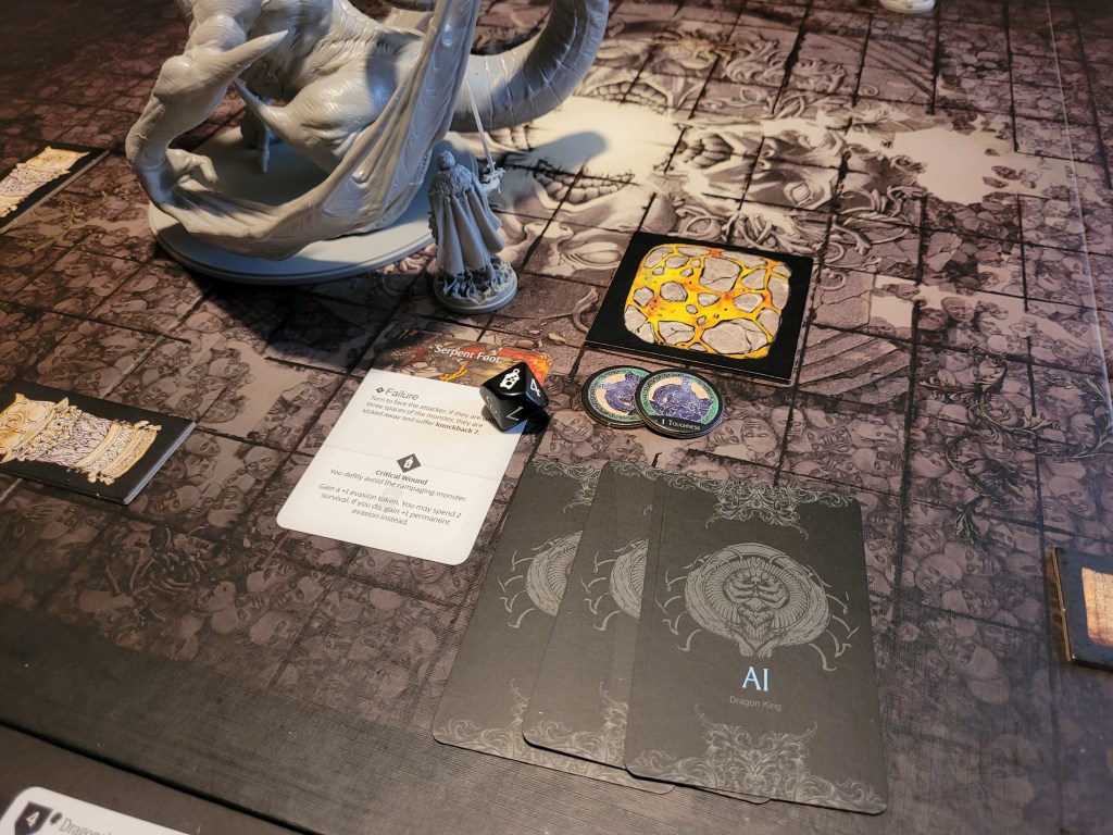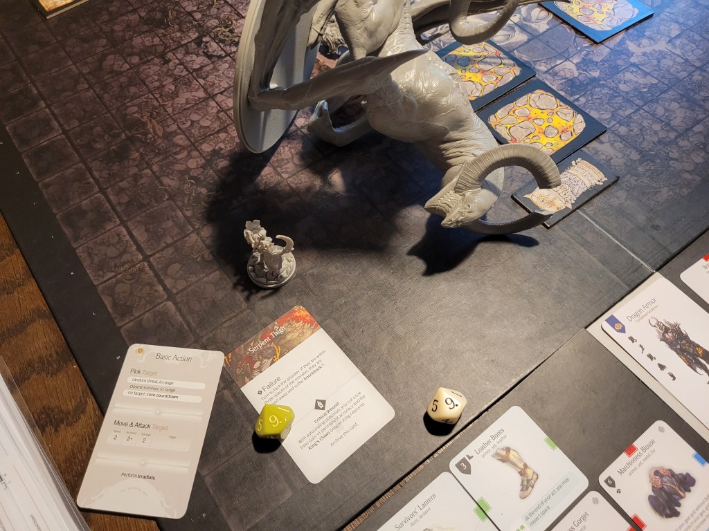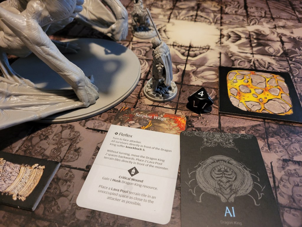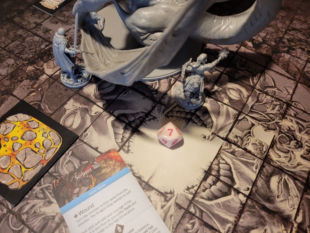 As a sword specialist he rolled first and then determined the hit location. A lantern 10 dealt 3 wounds as it removed the +1LCK and -1TGH-tokens. He also gained a Husk and placed a Lava Pool (T) as the monster’s boiling blood hit the stone ground from carving out a chunk of the Serpent Wings.